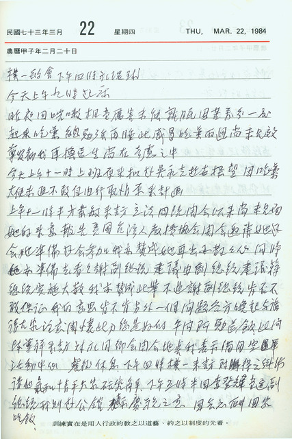 此為吳三連寫於1984年3月22日日記,吳三連昨夜因咳嗽未能入眠,吳尊賢因病況未好轉勸吳三連換醫生。今早原訂探望吳永吉逝世也因藥物副作用取消。上午方素敏來訪,告知吳三連美國臺灣人教授協會開會邀請她參加,吳三連表示贊同,同時贊成她藉由謝副總建議蔣經國實施大赦,吳三連雖無法確定謝東閔意願,但因此能令各方有所關注亦有好處。午間陳尊祥前來訪詢問同鄉會開會地點。下午與陳樸一研究與鵬得的糾紛。傍晚前往公館慶祝李登輝當選副總統。   1979年12月10日,美麗島雜誌社於高雄舉辦人權紀念會,吸引大批群眾參加,治安單位派出大批鎮暴部隊進行嚴密監視,最後導致場面失控,警民爆發嚴重衝突,警備總部隨後以叛亂罪嫌逮捕參與活動的相關人士,並進行軍法審判,係為「美麗島事件」。事件發生後加速台灣社會內部本土化與民主化的進程,長期由國民黨一黨專政之政治體制亦開始出現變化。同時,事件後,黃信介、姚嘉文、林義雄等受刑人為抗議國民黨不當審判,在獄中進行絕食抗議,受刑人家屬與台灣各界亦在獄外聲援絕食活動,從吳三連日記中可見其為營救美麗島事件受刑人多方奔走連繫之記載,本日林義雄之妻方素敏因準備建議由謝東閔向蔣經國提出大赦而向吳三連尋求意見,即是一例。