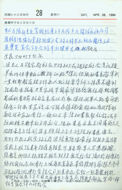 此為吳三連寫於1984年4月28日日記,吳三連赴環球水泥公司,與張寶樹有約。相談對於高雄事件5人犯之待遇不滿,希冀總統就任時開特赦減刑未果之事。也因此此等人犯有計劃絕食之計劃,其家族亦可能追隨絕食,討論後希望在待兩三天內探索各方情形再來檢討。   日記中提及環球水泥,1960年3月1日成立,資本額為新台幣一億元,吳三連為董事長,侯雨利為駐會常務董事,吳尊賢為常務董事兼總經理,顏岫峰為副總經理,同時還身兼財務部經理及廠長。環球水泥公司在吳三連的領導下,業務蒸蒸日上,總公司設於台北市,分設大湖及阿蓮兩廠,並在台中、嘉義、台南、高雄、屏東等地設立營業所。又,美麗島事件,起因為1979年5月由黃信介、施明德、張俊宏等人籌辦的黨外機關刊物《美麗島》雜誌。12月10日,《美麗島》雜誌社於高雄舉辦人權紀念會,吸引大批群眾參加,治安單位派出大批鎮暴部隊進行嚴密監視,最後導致場面失控,警民爆發嚴重衝突,警備總部隨後以叛亂罪嫌逮捕相關人士,並進行軍法審判,此為高雄事件。