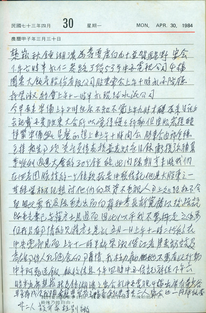 此為吳三連寫於1984年4月 30 日日記,上午10點吳三連匆匆趕往國賓飯店,開國賓股東大會,由許金德主持,報告公司資產損益等。此間陳朝亨來訪吳三連,對投資及人士分配不滿,向吳三連與陳重光陳情上報蔣彥士。上午11點半許榮淑、江春男來訪吳三連,談及高雄事件人犯絕食。下午6點半吳三連出席楚崧秋及鐘湖濱之宴會。   日記中提及高雄事件為美麗島事件,起因為1979年5月由黃信介、施明德、張俊宏等人籌辦的黨外機關刊物《美麗島》雜誌。12月10日,《美麗島》雜誌社於高雄舉辦人權紀念會,吸引大批群眾參加,治安單位派出大批鎮暴部隊進行嚴密監視,最後導致場面失控,警民爆發嚴重衝突,警備總部隨後以叛亂罪嫌逮捕相關人士,並進行軍法審判,官方當時定調為「高雄暴亂」。蔣彥士(1915-1998),浙江杭州人,國民政府遷台後,曾任行政院秘書長、教育部部長、外交部部長、中國國民黨中央委員會秘書長、總統府秘書長、總統府國策顧問、原子能委員會委員、總統府資政等職。楚崧秋生於湖南省湘潭縣,曾擔任故總統蔣介石與蔣經國秘書,為幕僚中唯一擔任過兩蔣秘書的人。曾擔 任中華日報社長兼總主筆、中央日報發行人兼社長、中國國民黨文工會主任、中國電視公司董事長。