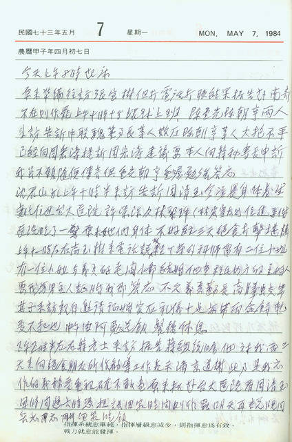 此為吳三連寫於1984年5 月7日日記,記述陳重光、陳朝亨來訪;沈君山來訪並傳達周清玉、許淑榮、林黎琤等人因絕食過程中身體不適而入院一事;蔣彥士來訪轉達蔣經國對於吳三連奔走聯繫受刑人絕食一事,表示謝意。    1979年12月10日,美麗島雜誌社於高雄舉辦人權紀念會,有大批群眾參加,治安單位派出大批鎮暴部隊進行嚴密監視,警民爆發嚴重衝突,是為「美麗島事件」。事件發生後,黃信介、姚嘉文等黨外人士遭逮捕、判刑入獄,在獄中期間,遭受諸多不合理的問訊與刑求,造成受刑人身心嚴重受創。獄受刑人為抗議國民黨政權,在獄中持續絕食抗議,獄外家屬周清玉(姚嘉文之妻)、許淑榮(張俊宏之妻)、林黎琤(林弘宣之妻)等人亦同時展開絕食聲援,吳三連為勸解他們勿以絕食傷害身體健康而多方奔走。