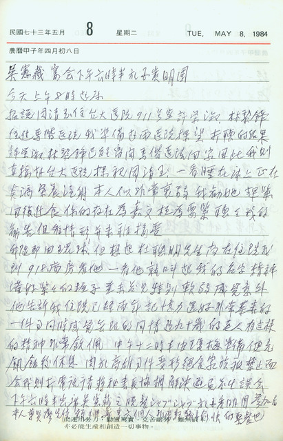 此為吳三連寫於1984年5月 8日日記,當日吳三連準備前往台大醫院、馬偕醫院探望周清玉、許淑榮、林黎鋒等人,但許、林二人已出院;吳三連為高雄事件致電蔣彥士協調處理,以免事態更嚴重。   1979年12月10日,美麗島雜誌社於高雄舉辦人權紀念會,有大批群眾參加,治安單位派出大批鎮暴部隊進行嚴密監視,警民爆發嚴重衝突,是為「美麗島事件」。事件發生後,黃信介、姚嘉文等黨外人士遭逮捕、判刑入獄,在獄中期間,遭受諸多不合理的問訊與刑求,造成受刑人身心嚴重受創。獄受刑人為抗議國民黨政權,在獄中持續絕食抗議,獄外家屬周清玉(姚嘉文之妻)、許淑榮(張俊宏之妻)、林黎琤(林弘宣之妻)等人亦展開絕食聲援,吳三連為勸解他們勿以絕食傷害身體健康而多方奔走。當日赴台臺大醫院探望周清玉之後,再前去探望住在台大醫院的杜聰明。杜聰明(1893-1986)為三芝人,是台灣首位醫學博士,1954年創辦高雄醫學院(今高雄醫學大學)。