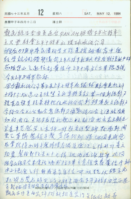 此為吳三連寫於1984年5月12日日記,記述三子吳凱民今日自美返台;吳三連應陳守山之邀,赴三軍總醫院探望黃信介;後致電吳三連囑其勸黃信介中止絕食行動;力霸水泥公司王理事長來訪。    1979年12月10日,美麗島事件發生後,黃信介、姚嘉文等黨外人士遭逮捕、判刑入獄,在獄中期間,遭受諸多不合理的問訊與刑求,造成受刑人身心嚴重受創。獄受刑人為抗議國民黨政權,在獄中持續絕食抗議。此日,警備總司令陳守山來電,請吳三連前往三軍總醫院勸黃信介勿以絕食傷害身體健康,吳三連對勸解一事雖無把握,仍前往探望。