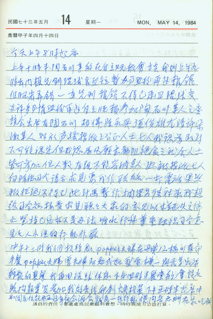 此為吳三連寫於1984年5月14日日記,吳三連上午赴自立晚報社,參加陶百川、胡佛、陳永興、張俊雄等人舉辦之座談會,是有關指派公正人士聲援美麗島事件受刑人絕食活動一事;中午,吳三連在國賓飯店12樓川菜部招待Mr. Popper夫婦,吳阿勉、謝式如等人亦出席聚會;下午,張麗堂來訪談水路問題,會後,參加中國開發信託25週年紀念酒會。   日記中所提之美麗島事件係1979年12月10日,美麗島雜誌社於高雄舉辦人權紀念會,吸引大批群眾參加,治安單位派出大批鎮暴部隊監視該活動,警民之間爆發嚴重衝突,警備總部隨後以叛亂罪嫌逮捕參與活動的相關人士,並進行軍法審判,係為「美麗島事件」。美麗島受刑人遭逮捕、判刑入獄,在獄中期間,遭受諸多不合理的問訊與刑求,獄受刑人為抗議國民黨政權,在獄中持續絕食抗議,獄外家屬、義光教會等亦展開絕食聲援,吳三連亦為勸解他們勿以絕食傷害身體健康,多方奔走。美麗島事件發生後,受到台灣國內外的關注,日記中提及的「公正人士」是陶百川、胡佛、陳永興、張俊雄、尤清、許榮淑等人為聲援美麗島受刑人之提議,但此提議被警備總部拒絕。