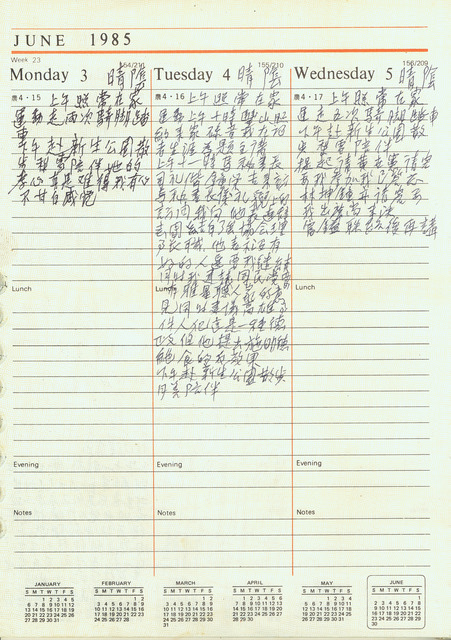 此為吳三連寫於1985年6月4日之日記。這天早上吳三連照例在家運動,之後吳豐山再次為了回憶錄來錄音,今天錄音的主題是記者生涯。接著有團結自強協會的馬秘書長和鍾榮吉一同來訪,吳三連再次表達想要辭去團結自強協會理事長的意願,但被對方以未有適當人選拒絕,同時吳三連也對美麗島事件、國民黨對待黨外的態度等提出建議,而馬秘書長也提到施明德絕食帶來的影響。下午在月美陪伴下前往新生公園散步。   日記中提到的錄音一事是吳豐山為替吳三連撰寫《吳三連回憶錄》所進行的口述訪談,這次的主題是記者生涯,即吳三連畢生致力的記者工作,後又加入自立晚報體系,樹立報業典範。又,日記中提及高雄事件,就是美麗島事件。事件發生於1979年,是因美麗島雜誌社成員為主發起的群眾演講、遊行,訴求民主自由的開放,但遊行過程不斷有騷亂,參加由行的群眾也遭受政府派出的鎮暴部隊包圍導致警民衝突。從吳三連歷來的日記中可以看出其相當關注此事件,也跟許多參與該事件的黨外人士或其家屬進行會晤,其中日記提到的施明德亦是該事件發起人之一,其絕食抗議自身罪名,也在之後獲得平反並出獄。