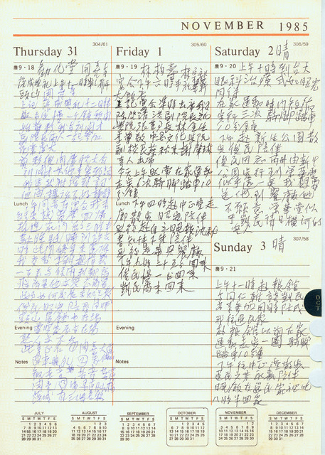 此係吳三連寫於1985年11月2日日記,今日如常在家運動;上午,由媳婦謝式如、秘書陳昭宏陪同到台大醫院眼科接受治療;下午,兒子俊民陪伴至新生公園散步後,俊民步行至榮華堂招待橫河會社客人。   吳三連自1984年患輕微腦血栓阻塞,治癒後,健康狀況受到影響,康復後,固定在家勤作運動、練外丹功,以維持體力,並外出走步運動。近年,為眼疾所惱,數次到台大醫院眼科就診,經檢查後,決定接受雷射治療。眼疾治療費時,自9月起已數次赴院復診、治療,後來,因患白內障接受雷射手術。又,日記中提到的橫河會社,是為橫河北辰電機株式會社,在1985年11月13日日記中提及橫河會社願意借款給凱民,由目前的資料中,雖尚未能掌握往來細節,不過,吳三連跨足媒體界、工商業、教育文化等領域,與日本企業界的合作交流亦是極待挖掘的一面向。