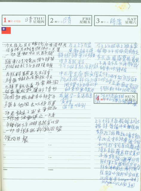 此為吳三連寫於1987年1月4日的日記。早上十點半吳三連去自立晚報報館,與同仁說到報紙上登李敖死了的廣告有缺常識,並談到面臨的官司問題。另外,因周清玉來訪,吳三連得知了林宗義回國為其父林茂生博士舉行百歲紀念追思祈拜,吳三連前往濟南教會安慰後即返家休息,此間長女梨雪與孫子Morgan(吳梨雪長子)也來拜訪。 林宗義( 1920 ~ 2010 ),二二八事件時失蹤的林茂生博士之子。日本東京帝國大學醫學部醫科畢業,臺灣精神科先驅,為台灣精神科發展上十分重要的人物,對精神科設立、現代精神健保、兒童特殊教育等都有貢獻。另外,他是一名基督徒,曾擔任濟南基督長老教會的長老。