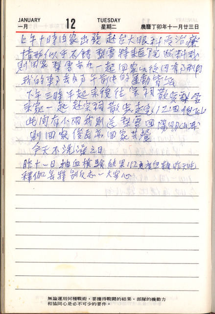 此為吳三連寫於1988年1月12日日記,本日吳三連看臺大眼科並接受治療,下午由長女吳梨雪陪同一起到吳氏宗祠散步。   日記中所提及的吳氏宗祠,1956年11月落成在南京東路。1950年代吳三連出任首任民選臺北市長後,許多吳氏宗親便與其商量組織宗親會、設立宗祠之事,吳三連本其慎終追遠、重視水源木本之觀念答應。1952年「臺北吳氏宗親會」正式成立,由吳三連任會長,並決議成立「吳氏宗祠」,宗祠興建委員會長亦由吳三連兼任。在其多方奔走下,於1953年成立了「財團法人讓德堂」,耗費三年終於建成了南京東路之舊祠堂。然因臺北都市中心逐漸繁榮,讓德堂原址之地價稅高漲不堪負荷,1971年吳三連在徵得宗親同意後,將宗祠原址改建為今「泰伯大樓」,收取租金以維持宗親會之運作費用。1978年,吳氏宗祠遷至頂北投,於每年春、秋二季舉行祭祖。