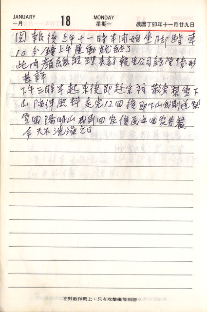 此為吳三連寫於1988年1月18日日記,本日吳三連如常閱報及運動。在這期間顏岫峰總經理來報告公司經營情況。下午由長女吳梨雪陪伴一起到吳氏宗祠散步。   日記中所提及的顏岫峰為侯雨利(1900-1989)的女婿。顏岫峰進入環球水泥公司時,受到當時環球水泥總經理吳尊賢賞識,在吳尊賢1978年退休後,顏岫峰順利接任總經理一職,後更升為副董事長、董事長。之後來拜訪吳三連的張麗堂,曾受聘為環球水泥公司法律顧問及訴訟代理人、南臺工專創辦人之一。日記中所提到的環球水泥股份有限公司於1959年6月,由吳三連與侯雨利等人籌組,於1960年3月通過核准核立,成立之初,由吳三連為董事長,侯雨利為駐會常務董事,吳尊賢為常務董事兼總經理,顏岫峰為副總經理。由環球水泥公司之成立,亦可見當時台灣處在以建立基礎工業為計畫目標的經濟發展時期。同時,從吳三連日記中,經常可見與環球水泥公司有關之記載,並可了解1960年代台灣水泥產業與經濟發展的一面向。