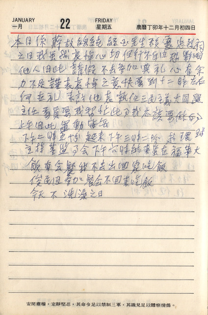 此為吳三連寫於1988年1月22日,本日吳三連因行動不自由,請假不參加蔣經國總統移靈典禮謹表哀悼之意。近12點時何世禮來拜訪吳三連,表示他就任三民主義大同盟主任委員要幫忙,吳三連認為是應該做的事。下午吳三連主持環球水泥公司董監事會。   日記提及蔣經國(1910-1988)為中華民國第六、第七任總統,病逝於任內。另外日記提及何世禮(1906-1998),曾為中華民國陸軍二級上將、國防部次長。最後日記提及三民主義統一大同盟,該會成立於1982年10月22日,成員組成包含國民黨、青年黨、工商界、宗教界、新聞界人員,是蔣經國因應1979年中華人民共和國人大常委會發表之〈告臺灣同胞書〉之後一系列和平統戰的回應。