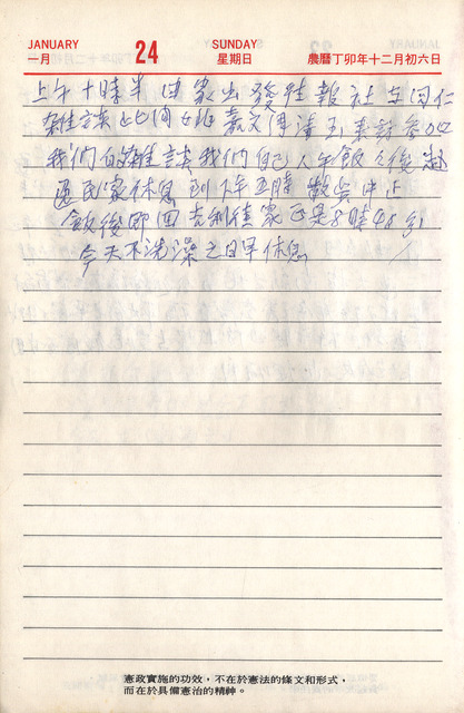 此為吳三連寫於1988年1月24日日記,本日吳三連如常前往自立報社與同仁雜談,並姚嘉文、周清玉夫婦一同參與雜談。   日記中提及的姚嘉文及周清玉為美麗島事件重要人物。姚嘉文出身於彰化,臺灣大學法律研究所碩士畢業,1979年因美麗島事件被捕入獄,多次在獄中絕食抗議,吳三連為此多方奔走,為美麗島事件絕食者協調。姚嘉文出獄後曾任民主進步黨黨主席、《美麗島》雜誌社發行人、總統府資政、考試院長。周清玉為姚嘉文妻子,1979年美麗島事件爆發後姚嘉文遭逮捕,為營救丈夫,在吳三連日記中常有記載周清玉為營救丈夫而來拜訪。其後周清玉「代夫出征」參選國大代表。曾任國大代表、彰化縣長、立法委員。