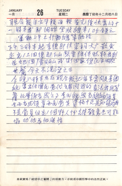 此為吳三連寫於1988年1月26日日記,本日吳三連如常在家閱報運動。下午由長女吳梨雪陪伴一起到吳氏宗祠散步。晚間聯合報記者來電詢問李登輝總統要出任國民黨代主席之看法,吳三連答覆當然之事,並十分願意支持協助他。   日記中提及李登輝(1923-),為中華民國第七、八、九任總統。自1984年由蔣經國總統提名為副總統,1988年蔣經國逝世,李登輝繼任總統,是第一位出身臺灣的總統。任內廢除動員戡亂臨時條款、展開修憲並中止萬年國會,使民意機關得以改選,讓臺灣進入快速民主化時代。並陸續開放直轄市與總統直選,1996年與連戰搭檔當選首任民選總統,並在2000年將政權和平轉移給民進黨。