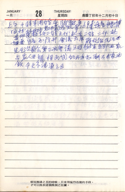此為吳三連寫於1988年1月28日日記,本日吳三連如常運動,及外丹功老師指導練功。下午出席第三次蔣經國總統治喪大會會議,於博愛路國防部會議室。   吳三連有相當規律的運動習慣,通常早上會以在家裡的走廊走步5 圈、騎腳踏車10 分鐘開始,或是與外丹功老師一同練習外丹功,下午再到外面散步約2 個小時,他常去散步的地點有:中正紀念堂、新生公園、北投的吳氏宗祠山坡地。   日記中提及蔣經國(1910-1988),中華民國第六、第七任總統,1975年蔣介石過世後,出任國民黨主席;1978年當選總統,12月,美國宣布將與中華人民共和國建交,不再承認中華民國。次年發生美麗島事件,國民黨當局決定鎮壓,而後為因應國際情勢的壓力,於1987年宣布解嚴、開放赴中國大陸探親,次年開放報禁。逝世於總統任內。