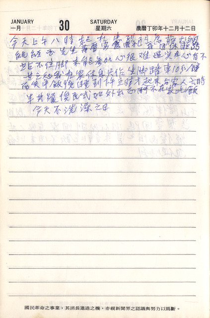 此為吳三連寫於1988年1月30日日記,本日吳三連未能參加蔣經國總統奉厝安靈典禮,因體弱站不住腳心感不甘。之後如常在家運動、吃飯、休息。   吳三連有相當規律的運動習慣,通常早上會以在家裡的走廊走步5 圈、騎腳踏車10 分鐘開始,或是與外丹功老師一同練習外丹功,下午再到外面散步約2 個小時,他常去散步的地點有:中正紀念堂、新生公園、北投的吳氏宗祠山坡地。   日記中提及蔣經國(1910-1988),中華民國第六、第七任總統,1975年蔣介石過世後,出任國民黨主席;1978年當選總統,12月,美國宣布將與中華人民共和國建交,不再承認中華民國。次年發生美麗島事件,國民黨當局決定鎮壓,而後為因應國際情勢的壓力,於1987年宣布解嚴、開放赴中國大陸探親,次年開放報禁。逝世於總統任內。