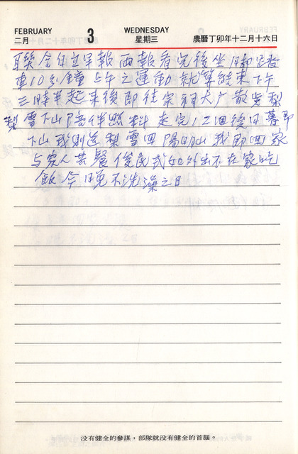 此為吳三連寫於1988年2月3日日記,本日吳三連如常閱報、運動。下午由長女吳梨雪陪伴一起在吳氏宗祠散步。   吳三連因在1984 年時中風,為了復健而養成了每日運動、散步的習慣,他常去的散步地點有:新生公園、北投吳姓宗祠、中正紀念堂。   吳氏宗祠讓德堂,建於1956年11月,地點位於今南京東路上。1950年代吳三連出任首任民選臺北市長後,許多吳氏宗親便與其商量組織宗親會、設立宗祠之事,吳三連本其慎終追遠、重視水源木本之觀念答應。1952年「臺北吳氏宗親會」正式成立,由吳三連任會長,並決議成立「吳氏宗祠」,宗祠興建委員會長亦由吳三連兼任。在其多方奔走下,於1953年成立了「財團法人讓德堂」,耗費三年終於建成了南京東路之舊祠堂。然因臺北都市中心逐漸繁榮,讓德堂原址之地價稅高漲不堪負荷,1971年吳三連在徵得宗親同意後,將宗祠原址改建為今「泰伯大樓」,收取租金以維持宗親會之運作費用。1978年,吳氏宗祠遷至頂北投,於每年春、秋二季舉行祭祖。