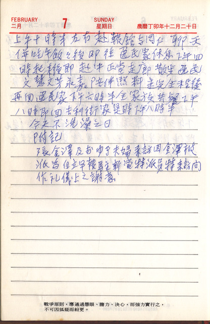 此為吳三連寫於1988年2月7日日記,上午10點半吳三連赴報館與同仁聊天。下午4點吳三連赴中正紀念堂走廊散步,由吳逸民家族陪伴照料。本日張金澤及おゆま夫婦來訪,因金澤被派為自立早報駐新營特派員特來訪問作禮儀上之謝意。   吳三連因在1984 年時中風,為了復健而養成了每日運動、散步的習慣,他常去的散步地點有:新生公園、北投吳姓宗祠、中正紀念堂。本日大兒子吳逸民帶著兒女吳文慧、吳文芳、吳永嘉陪同散步。吳逸民曾在1952年因白色恐怖案件被捕入獄,當年吳三連雖為台北市長仍無力營救,實為其心中一大痛事。   另,本日記載自立報社同仁張金澤夫婦來訪,由於吳三連長期擔任自立晚報發行人,秉持著中立的辦報態度來針砭時事。後更因中壢事件,察覺時代已較為開放,便以自立晚報作為舞臺,對於臺灣民主化的推動做出了很大的貢獻。其後雖年事已高在自立報社不再擔任任何職位,報社同仁遇重大事件,仍會向他請益,且從日記記載中仍可見其經常至自立報社與同仁聊時局或社務等問題,反之報社同仁間有任何的職務調動也都會來向他報告,本日張金澤夫婦來訪即為一例。