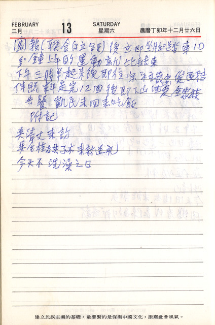 此為吳三連寫於1988年2月13日日記,本日吳三連如常在家閱報、運動後,下午由四子吳俊民陪伴一起到吳氏宗祠散步。此外本日有吳清文、吳金桂分別來拜訪吳三連。   由吳三連日記的記載,他有晨間閱報的習慣,通常會閱讀「聯合報與自立早報」,一來是關心自立早報的發行量;二來是看發行量最高的聯合報與自立早報的異同,提供給自立報社改善的方向。   本日吳三連至宗祠散步是吳俊民陪同照料,由於兩人同住,所以吳三連常常在日記中會提到吳俊民工作上的情況,如到異地出差、應酬、晚歸......等等。吳俊民出生於日本,二戰後隨吳三連返台後便未再移民外國,定居台灣。曾赴日本磐城水泥公司實習了一年八個月後,加入環球水泥公司工作,按部就班從業務員當起,最後當到董事。   日記中提及的吳氏宗祠建於於1956年11月,位於今南京東路。1950年代吳三連出任首任民選臺北市長後,許多吳氏宗親便與其商量組織宗親會、設立宗祠之事,吳三連本其慎終追遠、重視水源木本之觀念答應。1952年「臺北吳氏宗親會」正式成立,由吳三連任會長,並決議成立「吳氏宗祠」,宗祠興建委員會長亦由吳三連兼任。在其多方奔走下,於1953年成立了「財團法人讓德堂」,耗費三年終於建成了南京東路之舊祠堂。然因臺北都市中心逐漸繁榮,讓德堂原址之地價稅高漲不堪負荷,1971年吳三連在徵得宗親同意後,將宗祠原址改建為今「泰伯大樓」,收取租金以維持宗親會之運作費用。1978年,吳氏宗祠遷至頂北投,於每年春、秋二季舉行祭祖。