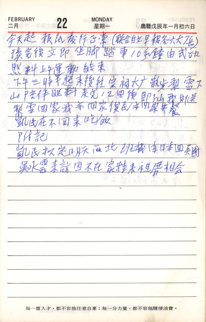 此為吳三連寫於1988年2月22日日記,本日吳三連如常在家閱報、運動後,下午長女吳梨雪陪同一起到吳氏宗祠散步。本日日記記載三子吳凱民明日將搭乘西北班機由日本返回美國,以及吳水雲來拜訪吳三連,吳水雲為花蓮縣吉安人,台灣師範大學教育系畢業。曾任花蓮明義國小校長、花蓮縣政府教育科中教股長、美崙國中校長、兩任花蓮縣縣長、監察委員。。   吳三連有晨間閱報的習慣,通常會閱讀「聯合報與自立早報」,一來是關心自立早報的發行量;二來是看發行量最高的聯合報與自立早報的異同,提供給自立報社改善的方向。   吳三連經常去散步的吳氏宗祠,為1956年11月建於南京東路,1950年代吳三連出任首任民選臺北市長後,許多吳氏宗親便與其商量組織宗親會、設立宗祠之事。1952年「臺北吳氏宗親會」正式成立,由吳三連任會長,並決議成立「吳氏宗祠」,宗祠興建委員會長亦由吳三連兼任。在其多方奔走下,於1953年成立了「財團法人讓德堂」,耗費三年終於建成了南京東路之舊祠堂。然因臺北都市中心逐漸繁榮,讓德堂原址之地價稅高漲不堪負荷,1971年吳三連在徵得宗親同意後,將宗祠原址改建為今「泰伯大樓」,收取租金以維持宗親會之運作費用。1978年,吳氏宗祠遷至頂北投,於每年春、秋二季舉行祭祖。