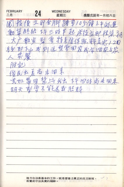 此為吳三連寫於1988年2月24日日記,本日吳三連如常在家閱報、運動後,下午由長女吳梨雪陪伴一起到吳氏宗祠散步。吳梨雪為吳三連的大女兒,住在陽明山,經常下山陪伴父親至宗祠散步。   吳三連因為與第四個兒子吳俊民同住,所以常常在日記中寫到吳俊民工作上的情況,如到異地出差、應酬、晚歸......等。   日記中提及的吳氏宗祠1956年11月建於南京東路,1950年代吳三連出任首任民選臺北市長後,許多吳氏宗親便與其商量組織宗親會、設立宗祠之事,吳三連本其慎終追遠、重視水源木本之觀念答應。1952年「臺北吳氏宗親會」正式成立,由吳三連任會長,並決議成立「吳氏宗祠」,宗祠興建委員會長亦由吳三連兼任。在其多方奔走下,於1953年成立了「財團法人讓德堂」,耗費三年終於建成了南京東路之舊祠堂。然因臺北都市中心逐漸繁榮,讓德堂原址之地價稅高漲不堪負荷,1971年吳三連在徵得宗親同意後,將宗祠原址改建為今「泰伯大樓」,收取租金以維持宗親會之運作費用。1978年,吳氏宗祠遷至頂北投,於每年春、秋二季舉行祭祖。