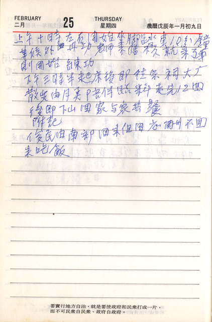 此為吳三連寫於1988年2月25日日記,本日吳三連如常在家運動、練習外丹功,由外丹功老師作陪。下午由月美陪伴一同到吳氏宗祠散步。   吳三連中風之後,即養成每日運動或練習外丹功的習慣。另外日記中提及的吳氏宗祠1956年11月落成在南京東路,1950年代吳三連出任首任民選臺北市長後,許多吳氏宗親便與其商量組織宗親會、設立宗祠之事,吳三連本其慎終追遠、重視水源木本之觀念答應。1952年「臺北吳氏宗親會」正式成立,由吳三連任會長,並決議成立「吳氏宗祠」,宗祠興建委員會長亦由吳三連兼任。在其多方奔走下,於1953年成立了「財團法人讓德堂」,耗費三年終於建成了南京東路之舊祠堂。然因臺北都市中心逐漸繁榮,讓德堂原址之地價稅高漲不堪負荷,1971年吳三連在徵得宗親同意後,將宗祠原址改建為今「泰伯大樓」,收取租金以維持宗親會之運作費用。1978年,吳氏宗祠遷至頂北投,於每年春、秋二季舉行祭祖。