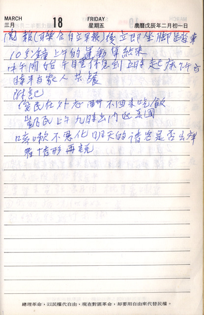 此為吳三連寫於1988年3月18日日記,本日吳三連如常在家閱報、運動。上午九點三子吳凱民返回美國,晚間四子吳俊民在外應酬不回家吃飯。   吳三連的日記中常常看到他對第四個兒子吳俊民之記載。吳俊民出生於日本,二戰後隨吳三連返台後便未再移民外國,定居台灣。曾赴日本磐城水泥公司實習了一年八個月後,加入環球水泥公司工作,按部就班從業務員當起,最後當到董事。因為同住,吳三連的日記中常常寫到吳俊民工作上的情況,如到異地出差、應酬、晚歸......等。   另吳三連有晨間閱報及運動的的習慣,在閱報方面通常會閱讀「聯合報與自立早報」,一來是關心自立早報的發行量;二來是看發行量最高的聯合報與自立早報的異同,提供給自立報社改善的方向。運動方面,則自中風以來每日養成在上午或走路、或騎腳踏車、或外丹功,下午則外出至吳氏宗祠或中正紀念堂等地散步,持續不間斷,可見其毅力驚人。