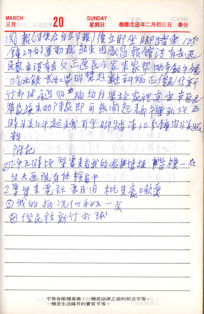 此為吳三連寫於1988年3月20日日記,本日吳三連如常在家閱報、運動後。中午吳三連因感冒未前往報館,於家中用餐。四媳謝式如帶孫女吳明慧赴齒科矯正;四子吳俊民往新竹打球;孫子吳永熙、孫女吳明珣往學校上學;晚間月美陪伴吳三連騎腳踏車運動。傍晚吳梨雪來探望吳三連病情,並說明陳樸一赴台大醫院身體檢查;吳尊賢打電話給吳三連可以使用枇貝膏嗽藥。   吳三連身為台灣重要的政、商界人物,平日裡多有聚餐開會、友人拜訪、處理公事等等要事,本日因吳三連感冒暫停所有活動,輕鬆地與家人團聚,共度家庭時光,更顯這段時光的可貴。   本日來探視吳三連的吳尊賢(1916年-1999 年)與吳三連是同鄉同宗,為「臺南幫企業集團」的第一代領導人之一。早年於侯基的臺南新復發布行當學徒,後與父親、胞兄吳修齊、吳俊傑等合創「臺南新和興布行」,為日後的事業基礎奠基。1955年,與吳三連、侯雨利、胞兄弟及親友等籌組「臺南紡織公司」,其後逐漸擴大投資,1960年設立「環球水泥公司」,擔任常務董事兼總經理。之後陸續參與籌設坤慶紡織、德興企業、臺灣針織、南帝化工、新和興海洋、環泥建設、南臺技術學院、萬通銀行……等公司,並發展多角化投資,臺灣玻璃、汎亞工程、利華羊毛、大臺北瓦斯、中國信託、新力電器、華南產物保險、國賓大飯店、福特六和汽車、九和汽車等,舉凡食、衣、住、行、育、樂、金融、保險等行業,均涵蓋其中,打造出了規模巨大的臺南幫企業集團。1981年,本諸「取之社會、用之社會」的信念,捐資創立「吳尊賢文教公益基金會」,捐助慈善公益事業、體育活動、學術研究機構,培育優秀人才,表揚愛心人士,對改善社會風氣不遺餘力。