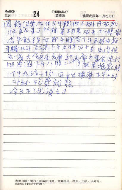 此為吳三連寫於1988年3月24日日記,本日吳三連如常在家閱報、練習外丹功,由外丹功老師作陪。下午5點40分吳三連前往邱創煥宴會,於國賓大飯店四春園。   吳三連有相當規律的閱報及運動習慣,在運動方面通常早上會以在家裡的走廊走步5 圈、騎腳踏車10 分鐘開始,或是與外丹功老師一同練習外丹功,下午再到外面散步。閱報方面通常會閱讀「聯合報與自立早報」,一來是關心自立早報的發行量;二來是看發行量最高的聯合報與自立早報的異同,提供給自立報社改善的方向。   日記中提及的邱創煥曾任銓敘部司長、台灣省社會處處長、中國國民黨中央社會工作會主任、內政部長、行政院副院長、台灣省政府主席、總統府資政、考試院資政、中國國民黨副主席等職務。中選會首任主委由時任內政部長之邱創煥兼任。