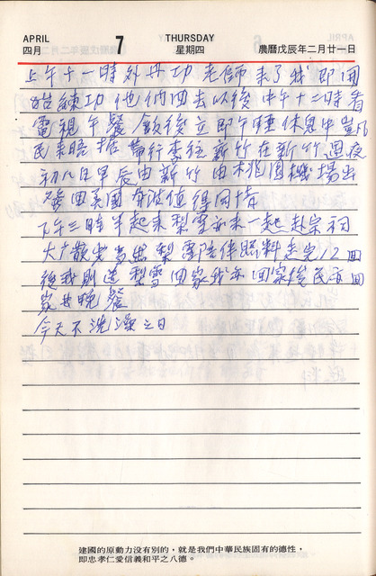 此為吳三連寫於1988年4月7日日記,本日吳三連如常在家練習外丹功,由外丹功老師作陪。下午由長女吳梨雪陪伴一起到吳氏宗祠散步。吳凱民本日先去新竹次日即直接到桃園機場回美國,所以來向父親辭行,吳三連不捨其如此奔波。   吳三連在1984 年中風後,為了復健而養成了每日運動、散步的習慣,他常去的散步地點有:新生公園、北投吳姓宗祠、中正紀念堂。吳梨雪為吳三連的大女兒,住在陽明山,平日若有空就會特地下山陪伴父親。   吳氏宗祠讓德堂,建於1956年11月,地點位於今南京東路上。1950年代吳三連出任首任民選臺北市長後,許多吳氏宗親便與其商量組織宗親會、設立宗祠之事,吳三連本其慎終追遠、重視水源木本之觀念答應。1952年「臺北吳氏宗親會」正式成立,由吳三連任會長,並決議成立「吳氏宗祠」,宗祠興建委員會長亦由吳三連兼任。在其多方奔走下,於1953年成立了「財團法人讓德堂」,耗費三年終於建成了南京東路之舊祠堂。然因臺北都市中心逐漸繁榮,讓德堂原址之地價稅高漲不堪負荷,1971年吳三連在徵得宗親同意後,將宗祠原址改建為今「泰伯大樓」,收取租金以維持宗親會之運作費用。1978年,吳氏宗祠遷至頂北投,於每年春、秋二季舉行祭祖。