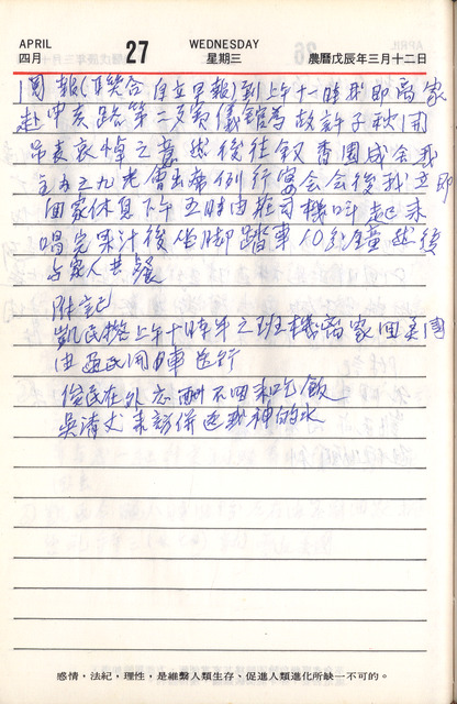 此為吳三連寫於1988年4月27日日記,本日吳三連如常在家閱報,運動則因赴辛亥路第二殯儀館,向許子秋表哀悼之意而改在下午。晚間往第一大飯店敘香園參加成舍我主辦的九老會。今日吳清文來訪送吳三連神的水。三子吳凱民今日搭機返美;四子吳俊民晚間外出應酬不在家。   由於吳三連與四子吳俊民同住,因此日記中常會提到吳俊民的日常生活作息。吳俊民出生於日本東京,自1946年底吳三連返台後,從臺灣教育中成長。退伍之後,加入吳三連環球水泥公司,一路由基層做起,據吳俊民的妻舅回憶,環泥曾經有要調遷人事,吳三連則告知不必因為吳俊民是他兒子就特別考慮,由此可見吳三連對於自己兒子在與自己相關的企業中工作絕不循私的作風。   本日吳三連出席的九老會,成員多為政治人物、媒體業大亨,更有幾位國民黨的高階將士名列其中。主要成員有余井塘、王雲五、成舍我、程滄波、阮毅成、樓桐孫、陶百川、范爭波、吳三連、顧祝同、楊亮功﹑吳開先等人,從這些名單可以發現吳三連作為國民黨統治集團和黨外人士的中介,在邁向民主化的這些年中扮演了相當重要的溝通協調角色。