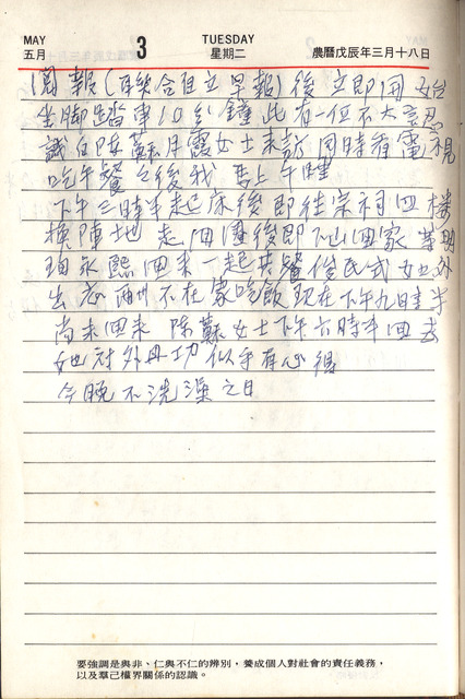 此為吳三連寫於1988年5月3日日記,本日吳三連如常在家閱報、運動後,下午吳三連赴吳氏宗祠四樓散步。晚間與孫女吳明珣、孫子吳永熙一起用晚餐。   吳三連晨間有閱報及運動的習慣,通常會閱讀「聯合報與自立早報」,一來是關心自立早報的發行量;二來是看發行量最高的聯合報與自立早報的異同,提供給自立報社改善的方向。運動方面除了走路騎腳踏車外,也會練外丹功,本日來訪的陳蘇月霞似乎對外丹功頗有心得,因此來探視吳三連。另,因與四子吳俊民同住,日記中也常有記載與其一家人相處情形及生活日常。   日記中提及的吳氏宗祠於1956年11月在南京東路落成。1950年代吳三連出任首任民選臺北市長後,許多吳氏宗親便與其商量組織宗親會、設立宗祠之事,吳三連本其慎終追遠、重視水源木本之觀念答應。1952年「臺北吳氏宗親會」正式成立,由吳三連任會長,並決議成立「吳氏宗祠」,宗祠興建委員會長亦由吳三連兼任。在其多方奔走下,於1953年成立了「財團法人讓德堂」,耗費三年終於建成了南京東路之舊祠堂。然因臺北都市中心逐漸繁榮,讓德堂原址之地價稅高漲不堪負荷,1971年吳三連在徵得宗親同意後,將宗祠原址改建為今「泰伯大樓」,收取租金以維持宗親會之運作費用。1978年,吳氏宗祠遷至頂北投,於每年春、秋二季舉行祭祖。