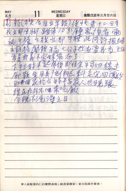 此為吳三連寫於1988年5月11日日記,本日吳三連如常在家閱報、運動後。在這期間許振緒來訪吳三連,說明廖欽福的七公子逝世,吳三連答應擔任治喪委員會主任委員。下午由月美陪伴一起到吳氏宗祠散步。   吳三連有相當規律的閱報及運動習慣,在運動方面通常早上會以在家裡的走廊走步5 圈、騎腳踏車10 分鐘開始,或是與外丹功老師一同練習外丹功,下午再到外面散步。本日照料的王月美為吳三連姪孫輩的太太,有姻親關係,吳三連晚年時期常來陪伴照顧。在閱報方面通常會閱讀「聯合報與自立早報」,一來是關心自立早報的發行量;二來是看發行量最高的聯合報與自立早報的異同,提供給自立報社改善的方向。   本日來訪的許振緒,為吳三連擔任台北市長時期的台北市議員,曾任新海瓦斯公司董事長、台北市煤氣有限公司常務監察人、台北市第一、二、四屆議會議員、台北市第一屆參議會議員。吳三連在回憶錄中提到,他在台北市長任內,有一筆紀念品的費用無法核銷,就是許振緒幫忙想辦法代為墊付,也因此吳三連一直對他心存感激。另外日記中提到的廖欽福為臺北大安人,畢業於私立臺灣商工學校(今開南商工),曾參與桃園大圳、嘉南大圳、日月潭水力發電工程等工作。1936年後,加入民間營造廠「協志商號」工作。1984年興建完成福華大飯店,至今發展為福華企業集團。