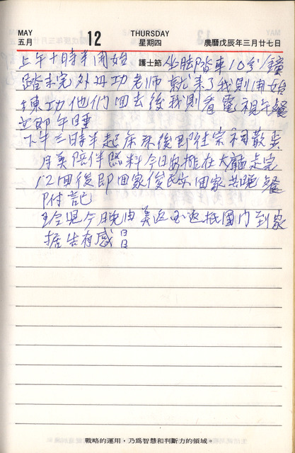 此為吳三連寫於1988年5月12日日記,本日吳三連如常在家練習外丹功,由外丹功老師作陪。下午由月美陪伴一起到吳氏宗祠散步。本日三媳丁玲兒今晚自美返臺。   吳三連有相當規律的閱報及運動習慣,通常早上會在家裡走步、騎腳踏車或是與練習外丹功,下午再到外面散步。本日照料的王月美為吳三連姪孫輩的太太,有姻親關係,吳三連晚年時期常來陪伴照顧。而自美返臺的丁玲兒是三子吳凱民的太太,她的母親丁顏梅為九份臺陽金礦公司創辦人顏雲年的姪女,其父親為顏國年,顏梅是以日文寫詩的詩人,曾任教於大同理工學院與明志工專,父親丁瑞鉠則是來自鹿港丁家,與吳三連同樣都是畢業於東京商科大學。   另外日記中提及的吳氏宗祠於1956年11月落成在南京東路。1952年「臺北吳氏宗親會」正式成立,由吳三連任會長,並決議成立「吳氏宗祠」,宗祠興建委員會長亦由吳三連兼任。在其多方奔走下,於1953年成立了「財團法人讓德堂」,耗費三年終於建成了南京東路之舊祠堂。然因臺北都市中心逐漸繁榮,讓德堂原址之地價稅高漲不堪負荷,1971年吳三連在徵得宗親同意後,將宗祠原址改建為今「泰伯大樓」,收取租金以維持宗親會之運作費用。1978年,吳氏宗祠遷至頂北投,於每年春、秋二季舉行祭祖。