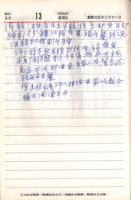 此為吳三連寫於1988年5月13日日記,本日吳三連如常在家閱報、運動後。下午由月美陪伴一起到吳氏宗祠散步。   吳三連有相當規律的閱報及運動習慣,通常早上會在家裡走步、騎腳踏車,或是與外丹功老師一同練習外丹功,下午再到外面散步。本日照料的王月美為吳三連姪孫輩的太太,有姻親關係,吳三連晚年時期常來陪伴照顧。報紙主要是閱讀「聯合報與自立早報」,一來是關心自立早報的發行量;二來是看聯合報與自立早報的異同,提供給自立報社改善的方向。此外,因與吳俊民同住,所以日記中常常可見吳俊民夫婦在工作上及日常生活情況的記載。   另外日記中提及的吳氏宗祠於1956年11月落成在南京東路。1952年「臺北吳氏宗親會」正式成立,由吳三連任會長,並決議成立「吳氏宗祠」,宗祠興建委員會長亦由吳三連兼任。在其多方奔走下,於1953年成立了「財團法人讓德堂」,耗費三年終於建成了南京東路之舊祠堂。然因臺北都市中心逐漸繁榮,讓德堂原址之地價稅高漲不堪負荷,1971年吳三連在徵得宗親同意後,將宗祠原址改建為今「泰伯大樓」,收取租金以維持宗親會之運作費用。1978年,吳氏宗祠遷至頂北投,於每年春、秋二季舉行祭祖。