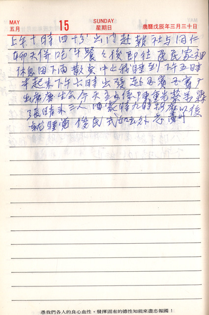 此為吳三連寫於1988年5月15日記,本日吳三連如常前往自立報社與同仁聊天、吃飯。晚間出席陳重光、蔡萬霖、張晴來主辦慶生會,於國賓飯店國賓廳。   由於吳三連長期擔任自立晚報發行人,一直秉持著中立的辦報態度來針砭時事而受人敬重,其後雖年事已高不再擔任自立任何職務,但從其日記記載中仍經常可他經常至自立報社與同仁聊時局或社務等問題。   晚間吳三連出席的慶生會是臺灣三十六位工商界和政界大老從1954年開始的每月定期餐會,以吳三連、許金德、陳重光以及幾個財團的領導人為中心,或因一起當過省議員,或相互結兒女親家、彼此有投資關係,因此聚為一團體,謝東閔、高玉樹則為每月的貴賓。會員採繼承制,長輩過世後由次一代子弟參加,報社出身的吳豐山是少數不經營營利事業的成員。   另,今晚聚會的國賓飯店則是由許金德、黃朝琴於1964年共同出資建立,店址在臺北市中山北路上,之後陸續在高雄、新竹等地建設新館。吳三連與許金德、黃朝琴等人因自立晚報社、臺灣省議會時期而有所交友,可以看見當時臺灣人在不同層面的互動往來。同時,亦從吳三連日記中經常可見在國賓飯店聚行宴會或親友聚會,該飯店亦是政商界經常集合聚會、招待外賓之用。