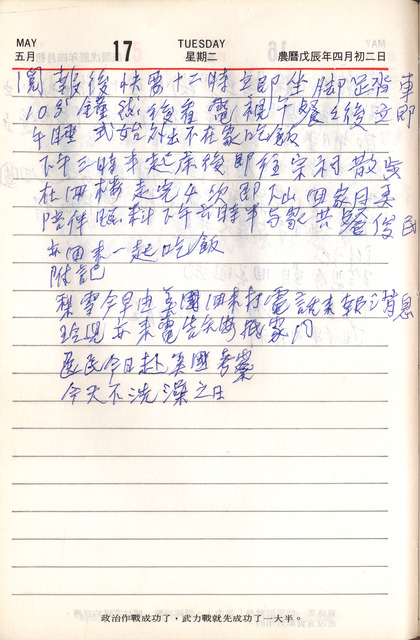 此為吳三連寫於1988年5月17日日記,本日吳三連一如往常閱報、運動後,下午由月美陪伴一起到吳氏宗祠散步。本日女兒梨雪自美返臺,大兒子逸民則赴美考察,三媳丁玲兒則平安抵達美國。   由於吳三連與四子吳俊民同住,日記中常會見到他對吳俊民夫婦日常生活及工作上的記載。此外,吳三連有相當規律的閱報及運動習慣,通常早上會在家裡走步、騎腳踏車或練習外丹功,下午再到外面散步。本日照料的王月美為吳三連姪孫輩的太太,有姻親關係,吳三連晚年時期常來陪伴照顧。   今日赴美考察的吳逸民為吳三連的大兒子,於1952年就讀台大經濟系時,因涉入白色恐怖案件「台灣民主同盟歐振隆案」被捕入獄,判刑10年,刑滿後又因在獄中閱讀有關馬克思思想的言論,再遭感化3年。當年吳三連雖為台北市長仍無力營救,實為其心中一大痛事。之後吳逸民主要服務於日商伊藤忠商事株式會社台北支店管理與合作事業部門,共計17年,期間3年(1971~1974年)兼任統一製衣公司總經理;1981~1983年任朋得實業公司董事長,1983~1993年先後任凱得公司總經理、董事長兼總經理。退休後從事國際貿易,業餘曾教授日文,財團法人吳三連獎基金會副董事長、財團法人吳三連台灣史料基金會董事,及吳姓宗親會常務理事。