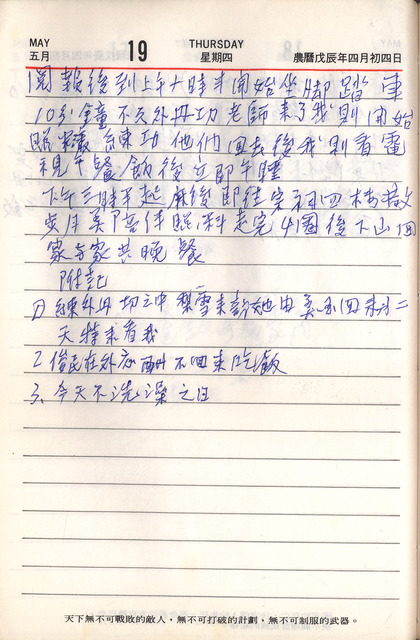 此為吳三連寫於1988年5月19日日記,本日吳三連如常在家閱報、練習外丹功,由外丹功老師作陪。下午由月美陪伴一起到吳氏宗祠散步。才剛由美國回來臺灣的女兒吳梨雪來探望他。   由於吳三連與四子吳俊民同住,日記中常會見到他對吳俊民夫婦日常生活及工作上的記載。此外,吳三連有相當規律的閱報及運動習慣,通常早上會在家裡走步、騎腳踏車或是與外丹功老師一同練習外丹功,下午再到外面散步。本日照料的王月美為吳三連姪孫輩的太太,有姻親關係,吳三連晚年時期常來陪伴照顧。閱報則多半是「聯合報與自立早報」,一來是關心自立早報的發行量;二來是看聯合報與自立早報的異同,提供給自立報社改善的方向。   另外日記中提及的吳氏宗祠於1956年11月落成在南京東路。1952年「臺北吳氏宗親會」正式成立,由吳三連任會長,並決議成立「吳氏宗祠」,宗祠興建委員會長亦由吳三連兼任。在其多方奔走下,於1953年成立了「財團法人讓德堂」,耗費三年終於建成了南京東路之舊祠堂。然因臺北都市中心逐漸繁榮,讓德堂原址之地價稅高漲不堪負荷,1971年吳三連在徵得宗親同意後,將宗祠原址改建為今「泰伯大樓」,收取租金以維持宗親會之運作費用。1978年,吳氏宗祠遷至頂北投,於每年春、秋二季舉行祭祖。
