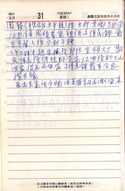 此為吳三連寫於1988年5月31日日記,本日吳三連如常閱報、運動。下午由次子吳得民陪伴一起到吳氏宗祠散步。   吳三連一直以來保持著相當規律的閱報及運動習慣,在運動方面通常早上會在家裡以走步、騎腳踏車或是練外丹功,下午則會到宗祠、中正紀練堂......等地散步,同常是由女兒梨雪陪伴,有時則由其他子女或親戚王月美或秘書陳昭宏同行照料。他對健康相當注重,因此在日記中常見到對於通便情形的記錄。早上閱報主要是閱讀「聯合報與自立早報」,一來是關心自立早報的發行量;二來是看聯合報與自立早報的異同,提供自立報社改善的方向。   本日陪同散步的是前幾日才自美返臺的二子吳得民,他曾因被列為黑名單而有一段時期無法返回臺灣。黑名單的產生是國民黨為了對付海外異議分子所執行的策略。其產生的背景可溯自1949年為防止共產黨及政治異議份子,而開始執行的入出境管制作業。1970年代,中國國民黨為鞏固其執政優勢,透過情治系統來防範言論,將散播違反「反共國策」,提出台獨言論者都予以管制入境。由於情治單位完全是黑箱作業,只要被認定為異議份子,就會被列入黑名單。在台灣威權統治時期,不少被迫流亡海外的台灣人,都成為國民黨眼中的黑名單。他們必須利用各種管道才能偷渡回台,但政府都會以「違反國安法」之名加以逮捕或是驅逐出境。