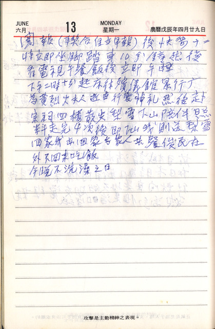 此為吳三連寫於1988年6月13日日記,本日吳三連如常在家閱報及運動,下午前往殯儀館景行廳,出席黃烈火夫人喪禮,結束後由吳梨雪陪同到吳氏宗祠散步,晚上與家人晚餐。黃烈火,彰化鹿港人,是吳三連的好友,經日記中常可見他們討論時事、聚餐等記載,黃烈火於日治時期與友人赴日本神戶創設「和泰商行」,二戰後幾經改組,業務內容亦有調整,與日本豐田汽車亦有合作關係。   下午有散步習慣的吳三連,本日散步地點為吳氏宗祠,於1956年11月落成,地點在今南京東路。1952年「臺北吳氏宗親會」成立時,由吳三連擔任會長,經決議通過興建吳氏宗祠,宗祠興建委員會會長由吳三連兼任,1978年,吳氏宗祠遷至頂北投,於每年春、秋二季舉行祭祖,宗祠原址則改建為今「泰伯大樓」。