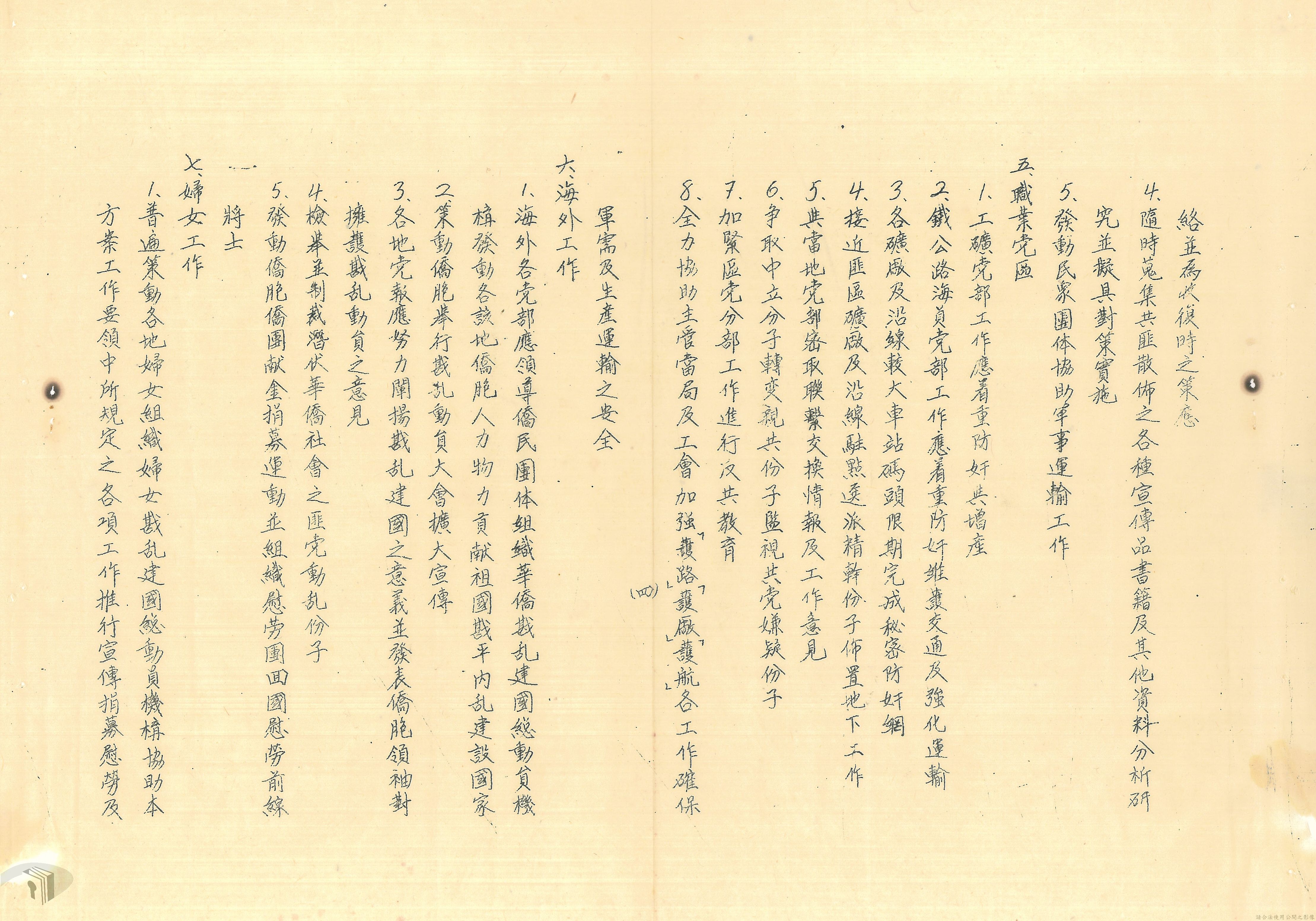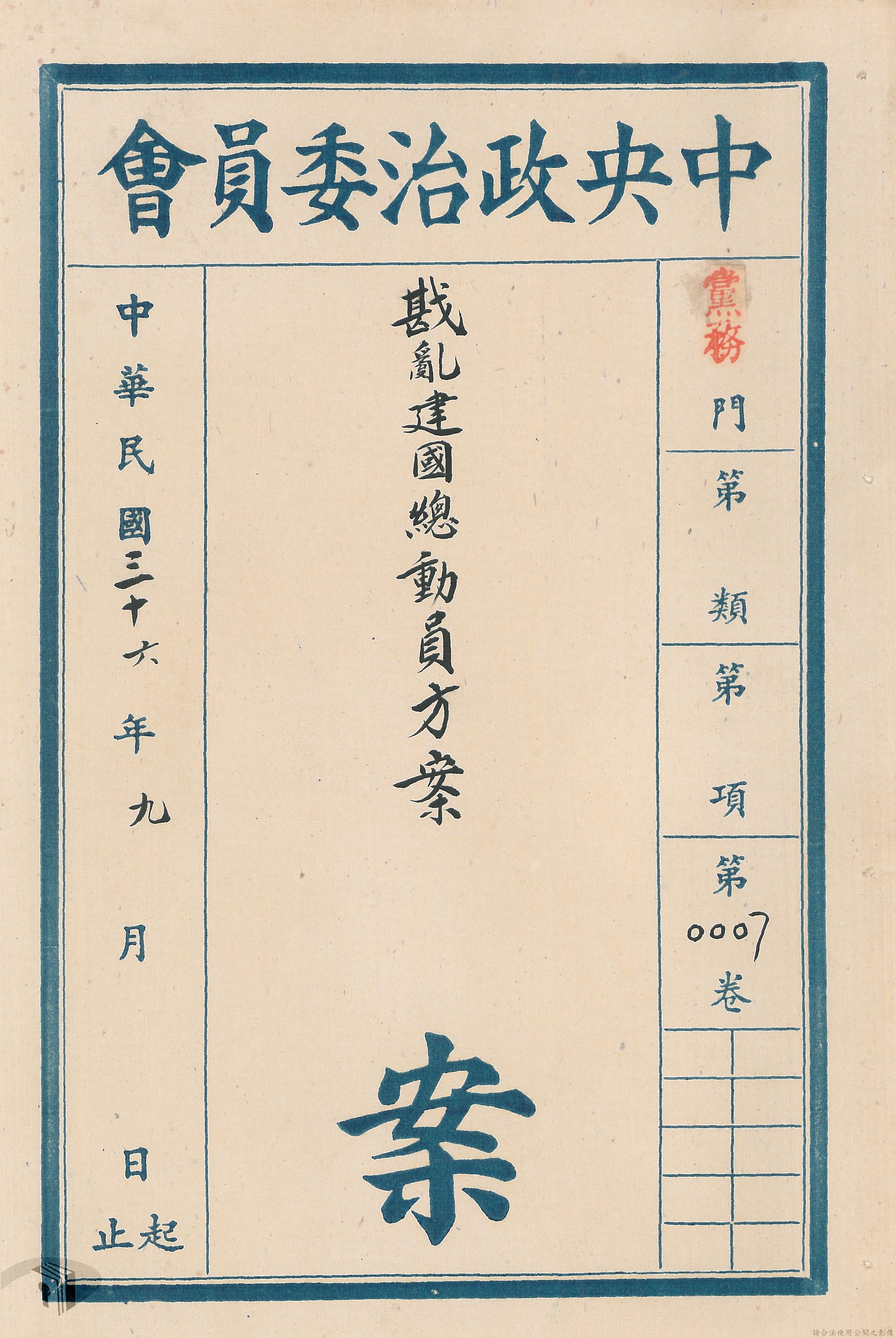 本案為36年間,中國國民黨中央執行委員會檢送會議通過之「中國國民黨戡亂建國總動員」予中央政治委員會秘書處。