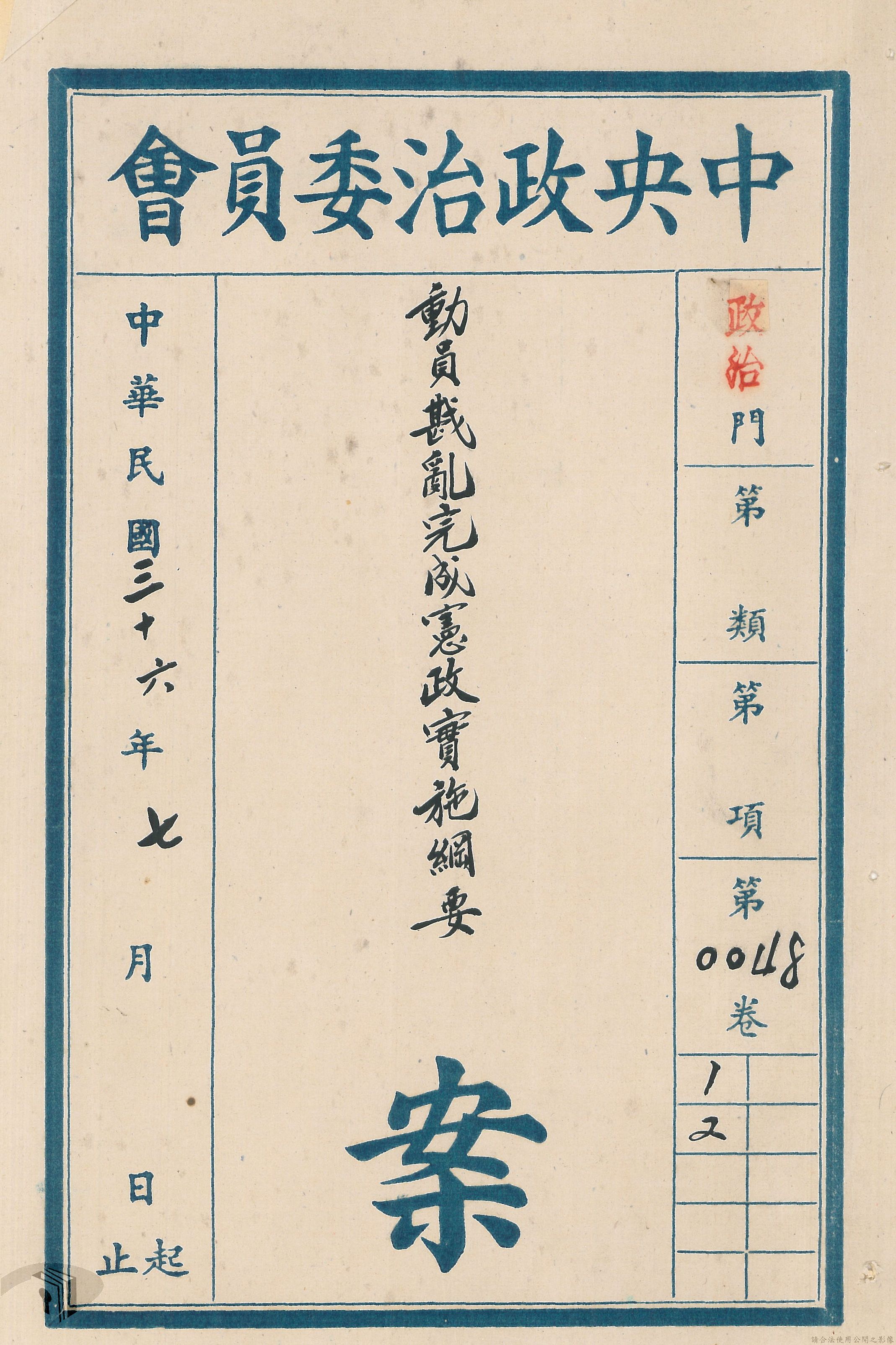本案為36年間,行政院檢送動員戡亂完成憲政實施綱要予中央政治委員會秘書處。附動員戡亂完成憲政實施綱要。