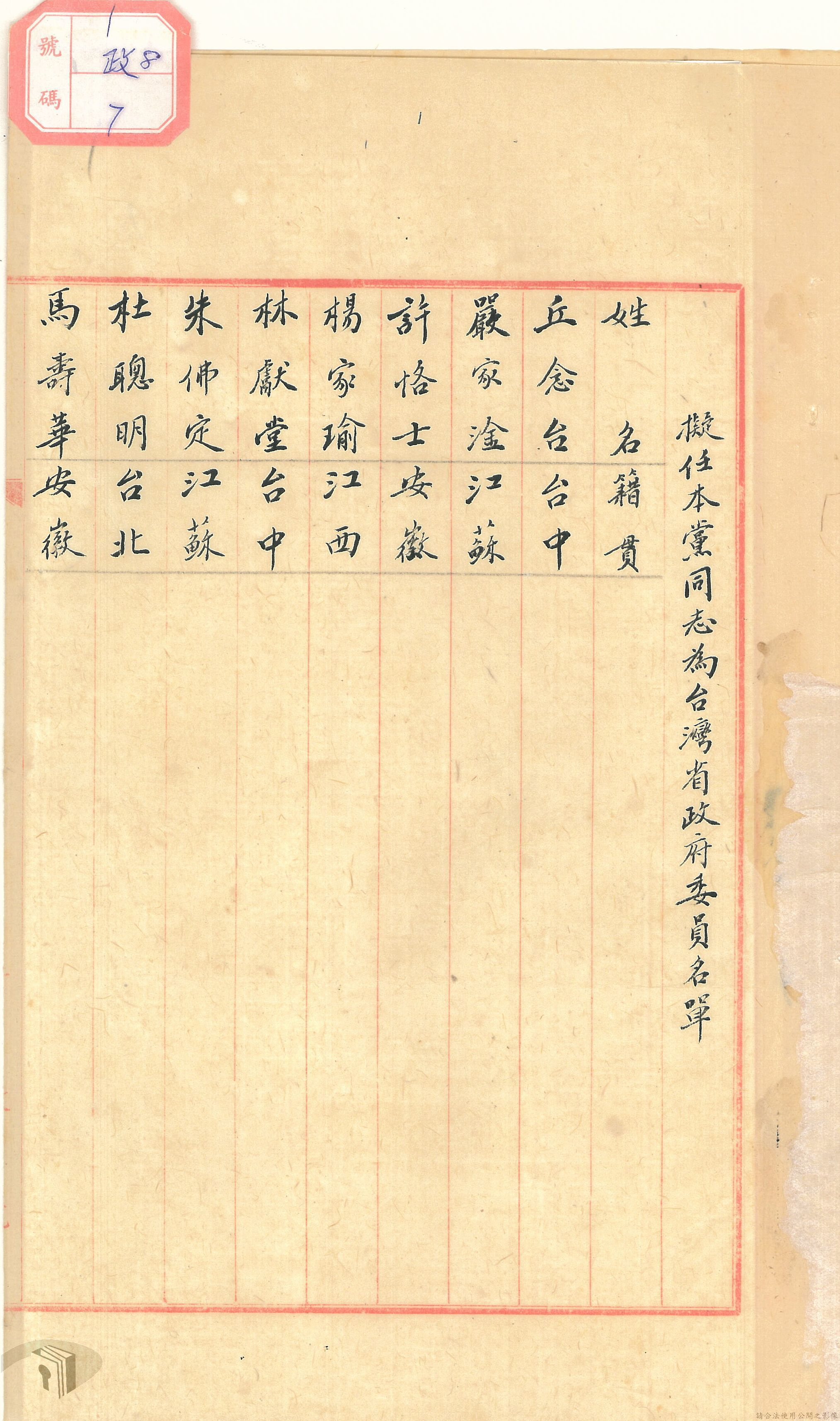 本案為36年間,中央政治委員會秘書處檢送國民黨員為臺灣省政府委員名單予委員。附名單。