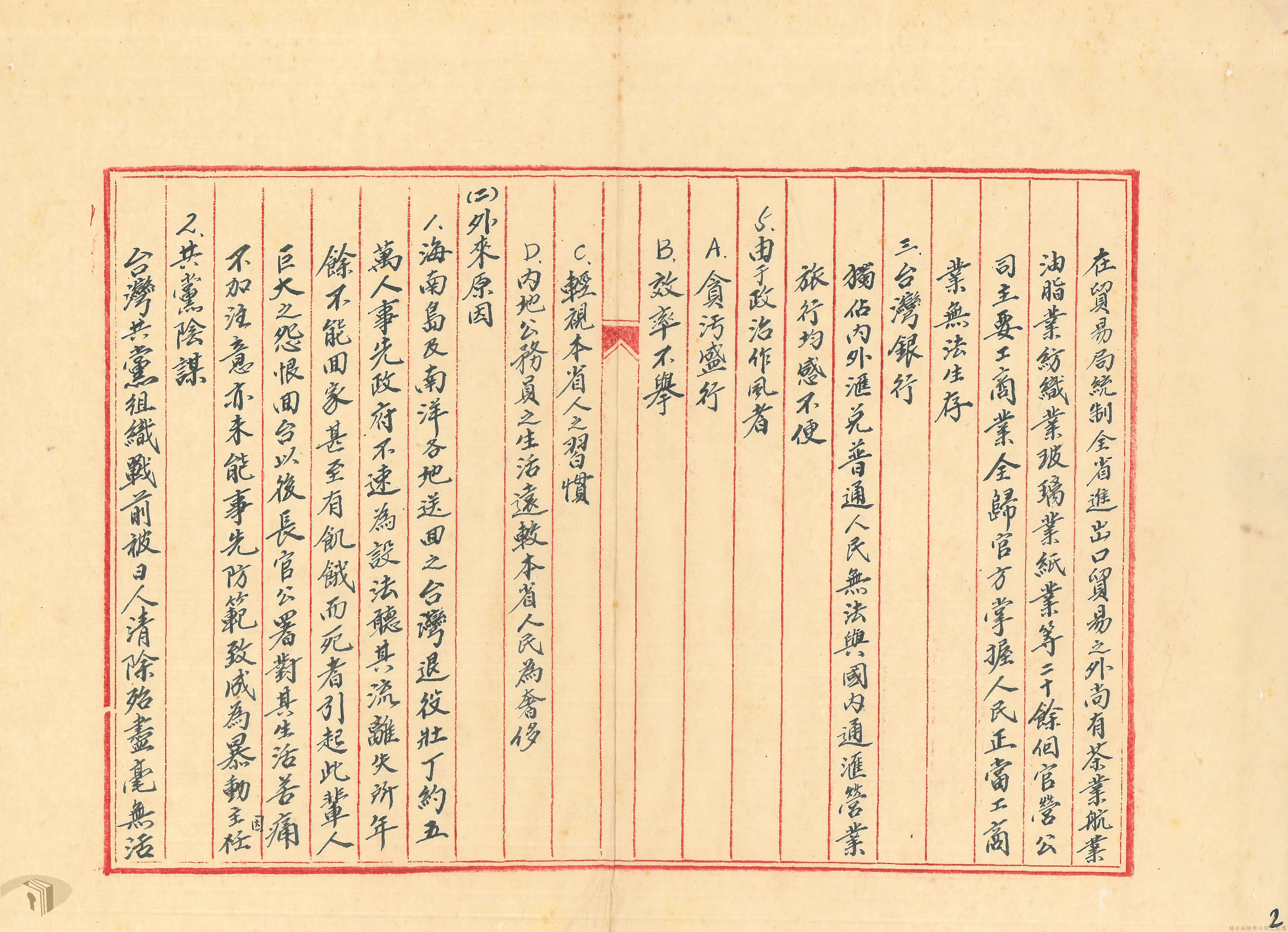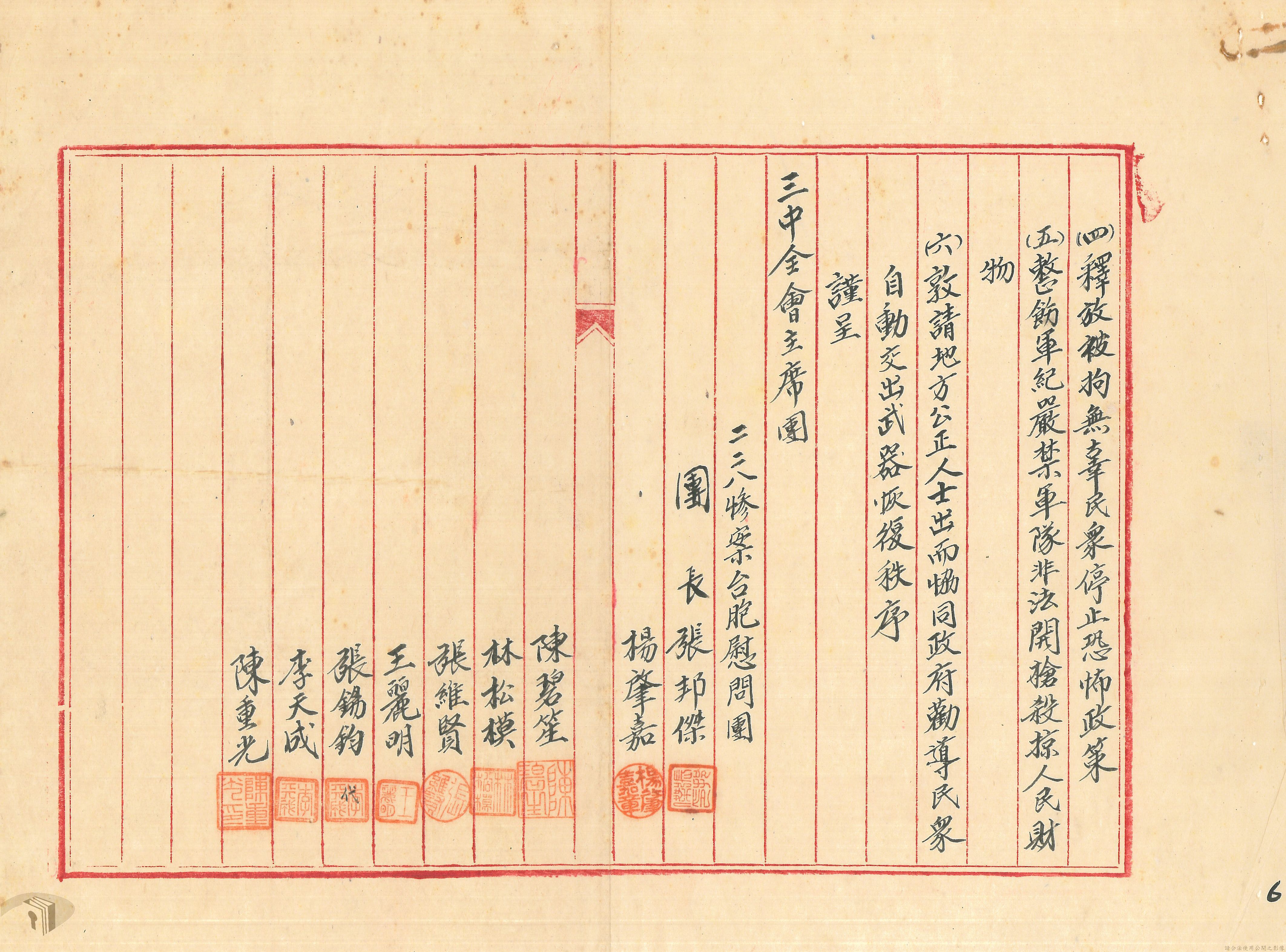 本案為36年間,二二八慘案台胞慰問團檢送處理臺灣事變意見書予中全會主席,該意見書從內部及外來原因分析二二八事件產生之原因,並對處置方式做出建議。
