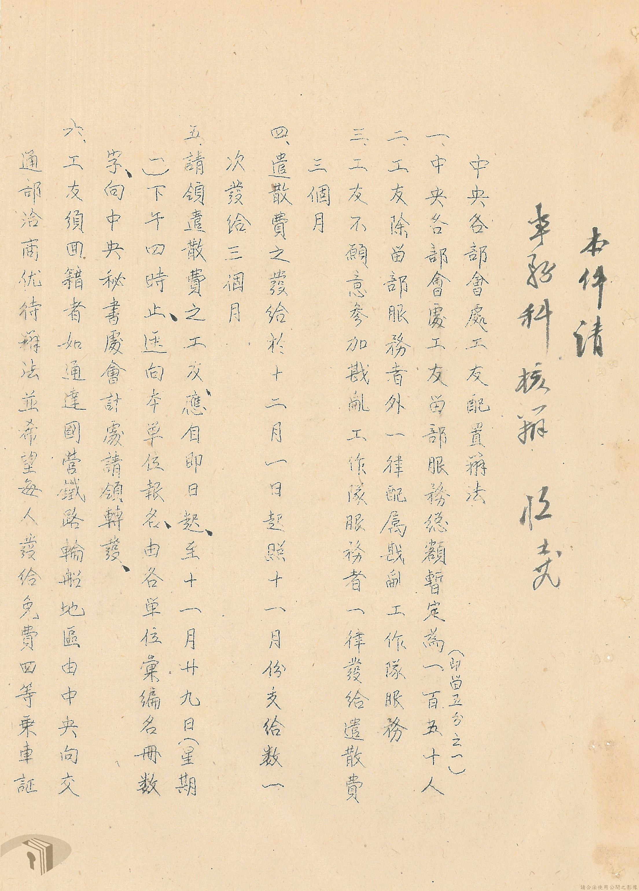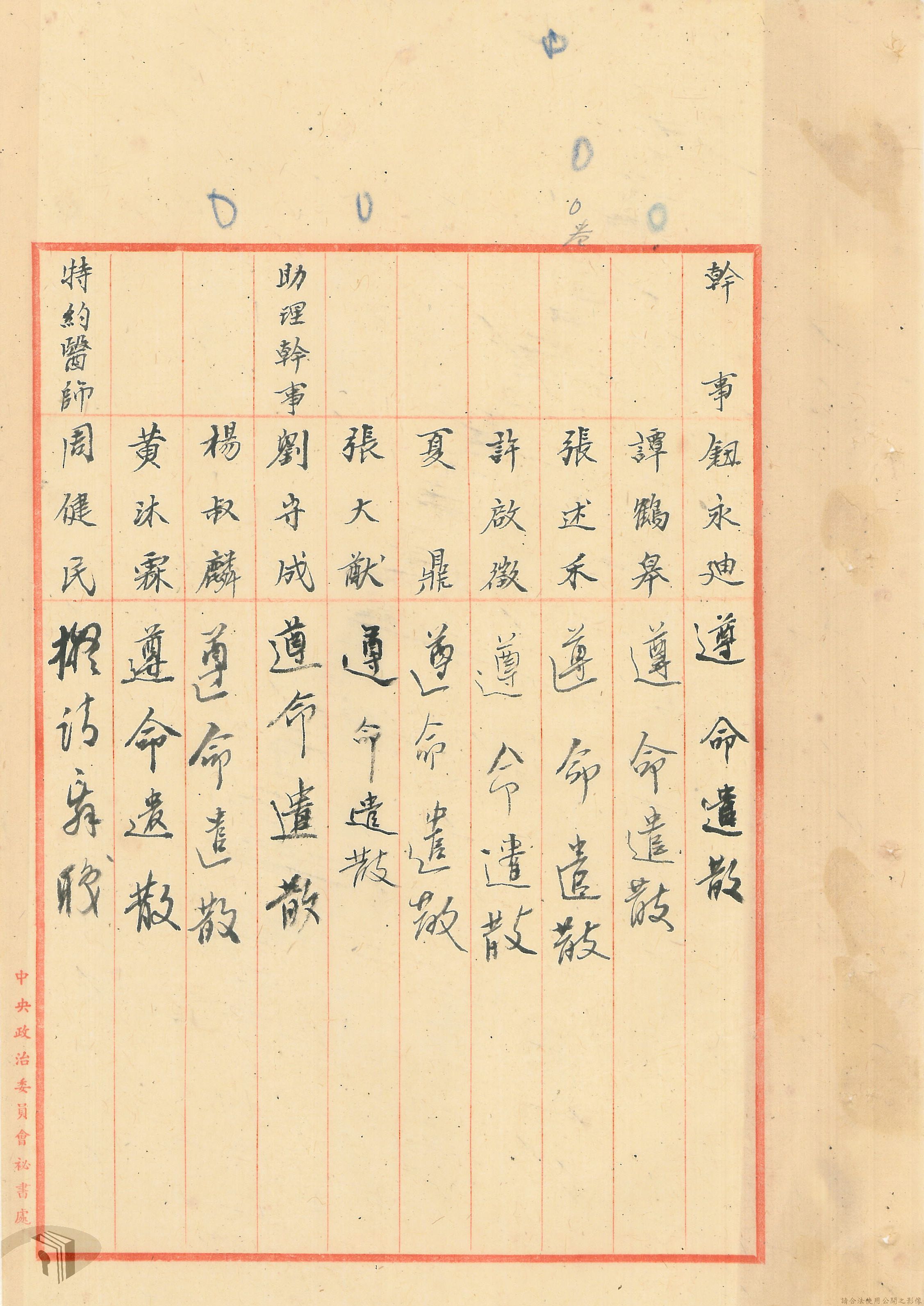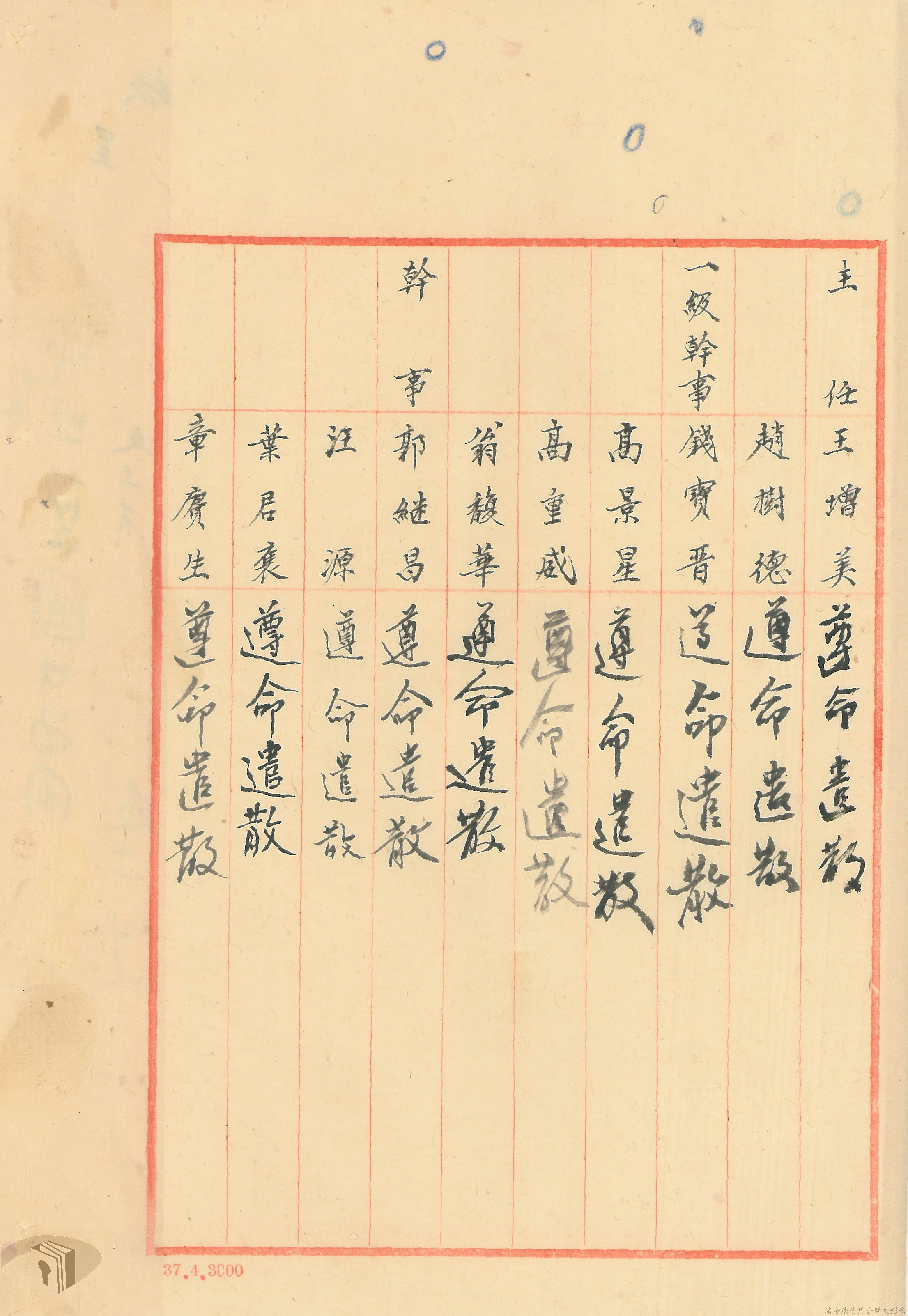 本案為37年間,中央各部會處工作人員不願參加戡亂工作隊者之處理辦法、中央政治委員會工作人員名單、中央各部會處工友配置辦法等文件資料。
