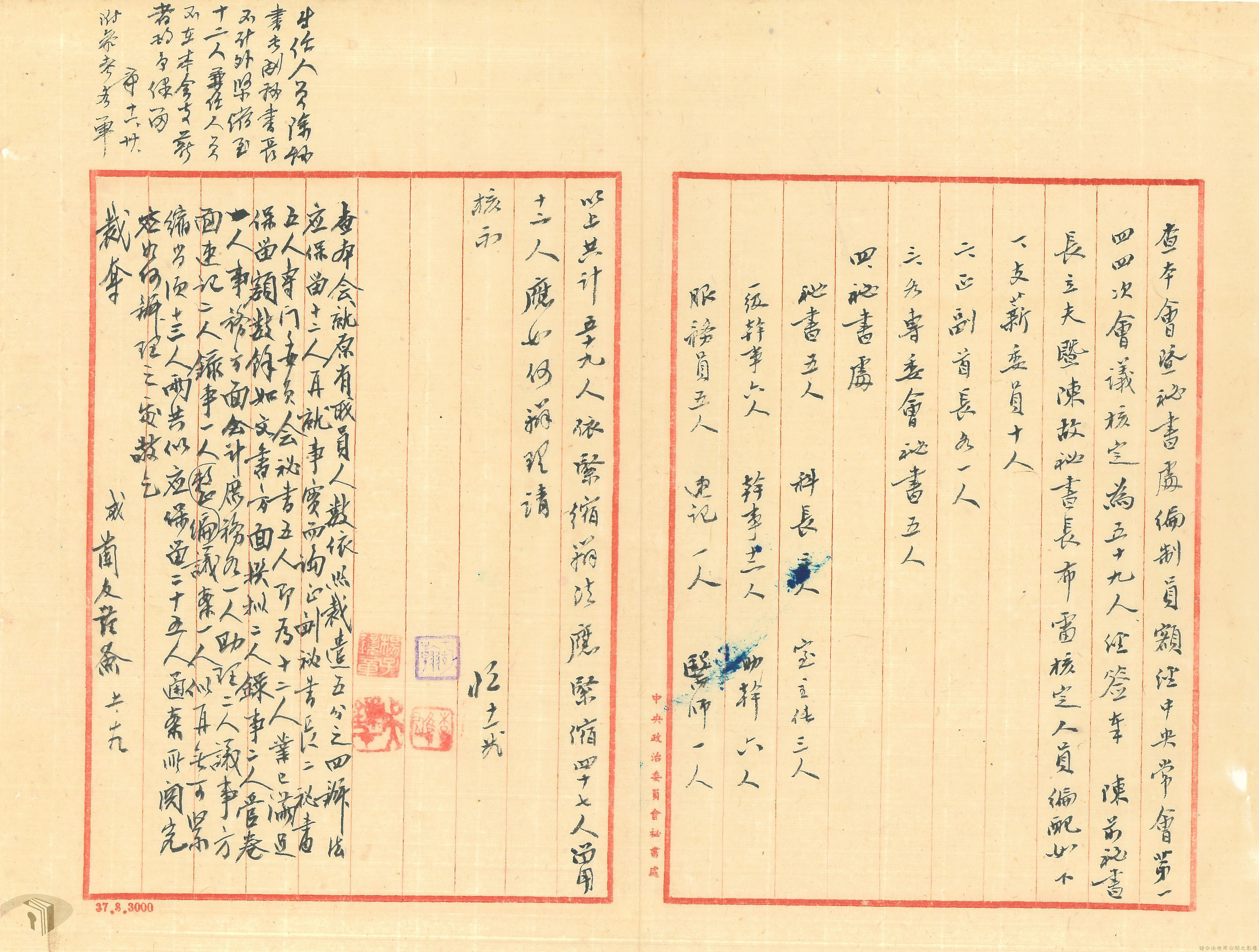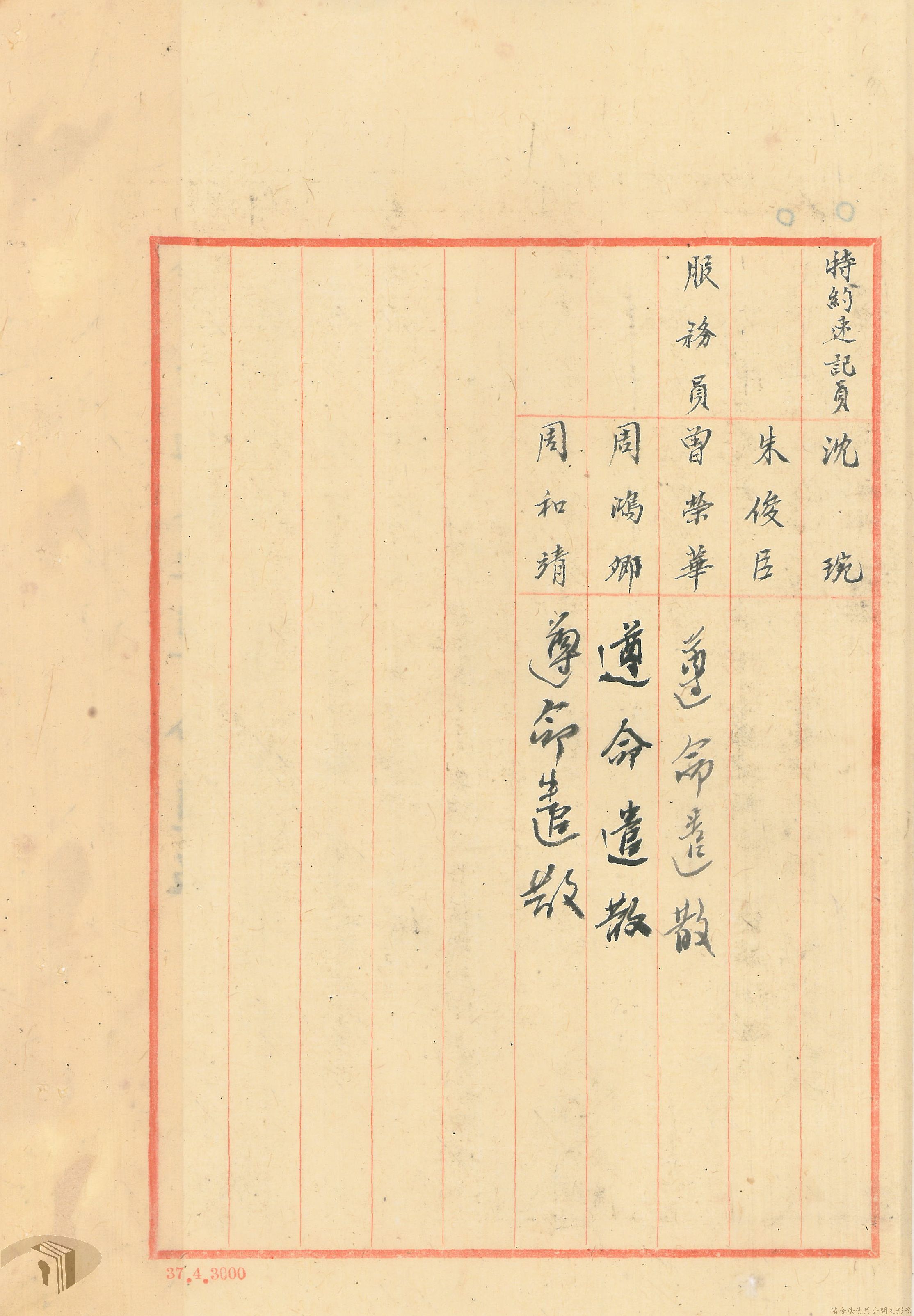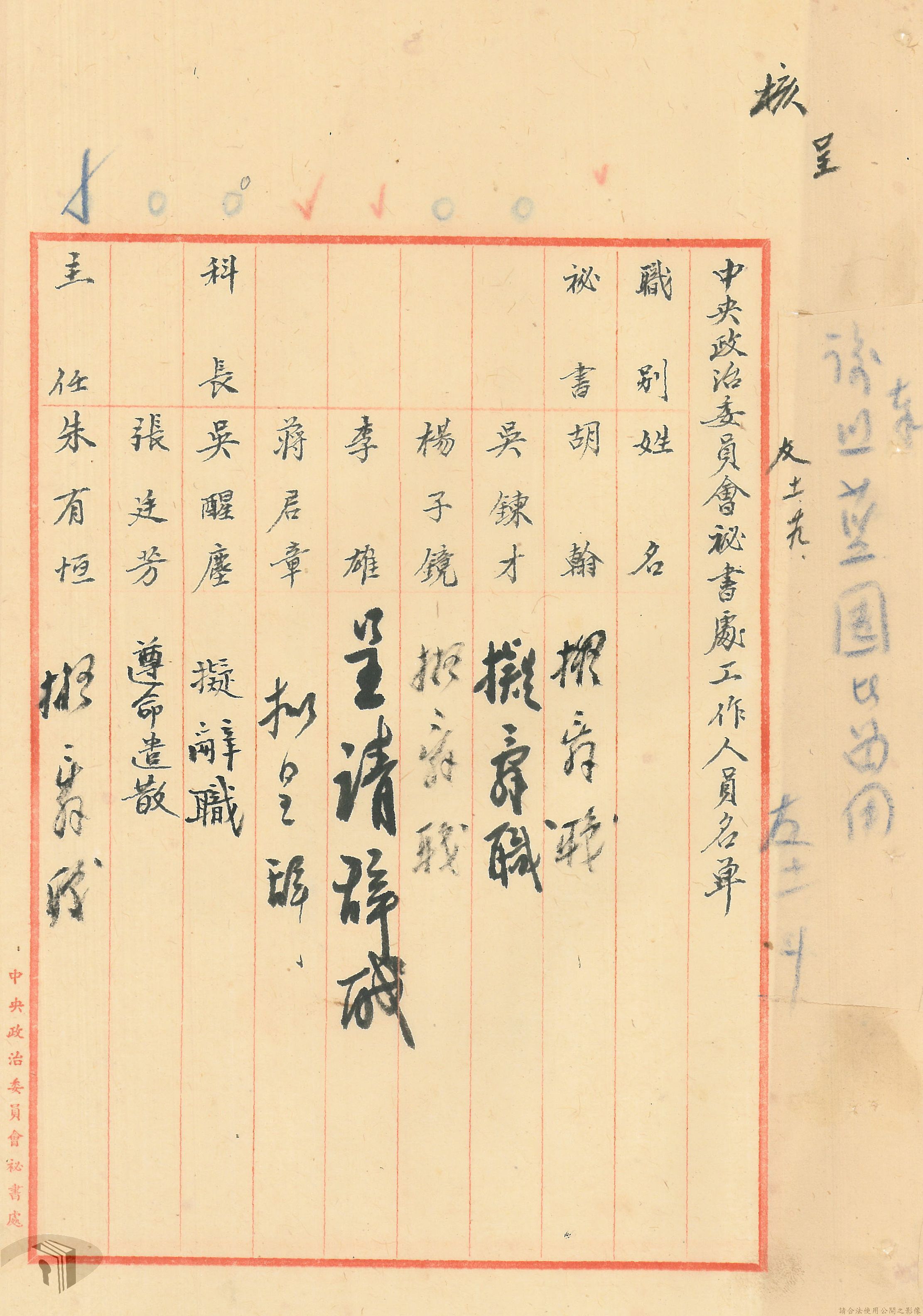 本案為37年間,中央各部會處工作人員不願參加戡亂工作隊者之處理辦法、中央政治委員會工作人員名單、中央各部會處工友配置辦法等文件資料。