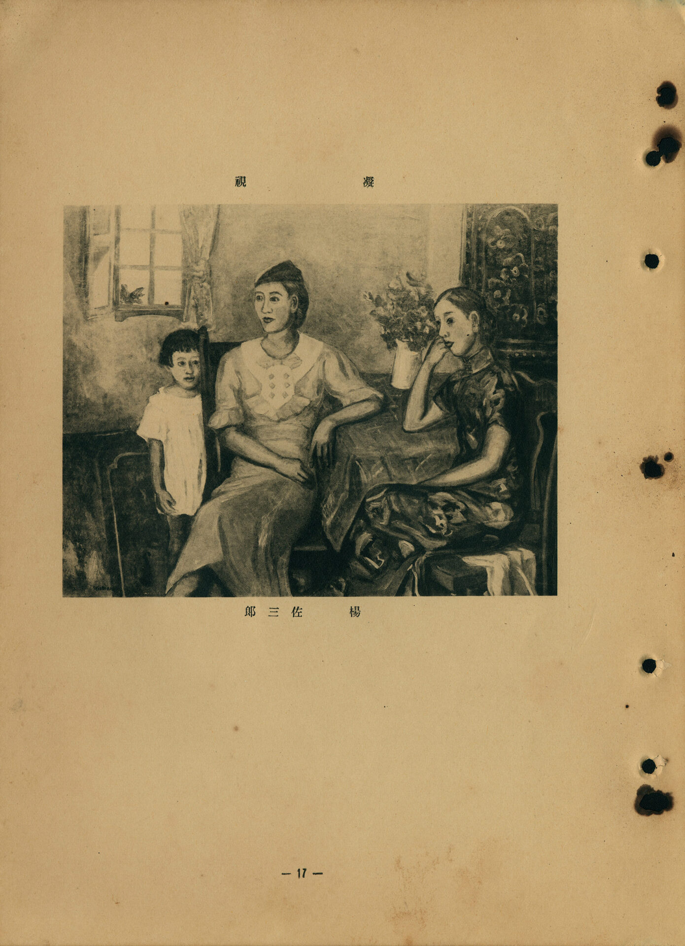 此為1936年(昭和11年)第十回臺展西洋畫部楊佐三郎的無鑑查(免審查)參展作。這件作品描繪坐在桌子旁的兩名婦人,以及站在左側女性座椅後方的孩童,分別向左側與前方「凝視」的景象。畫面空間處於擺放西式家具的空間,包含靠在畫面右後方花紋外觀櫥櫃,以及造型雅致的桌椅等等,反映屋主人(楊三郎與其家族)的生活品味。桌上擺有盛開的瓶花,則讓人聯想到楊三郎家族永和網溪別墅的菊花庭園。畫中靠坐在桌子旁的婦人們,分別身穿中式旗袍與西式洋裝,造型有所呼應。其中畫面右側著旗袍的婦人,從臉部特徵推測為楊三郎的妻子許玉燕(1910-2012),打扮讓人聯想到楊三郎以許玉燕為模特兒,入選第十三屆日本春陽展的作品〈持扇婦人像〉(1934),不過兩者的袖長與領口、裙擺樣式略有不同。落款「SASABURO」位於畫作左下角,之後的文句難以判讀,其中「SASABURO」為「佐三郎」的日語讀音縮寫。