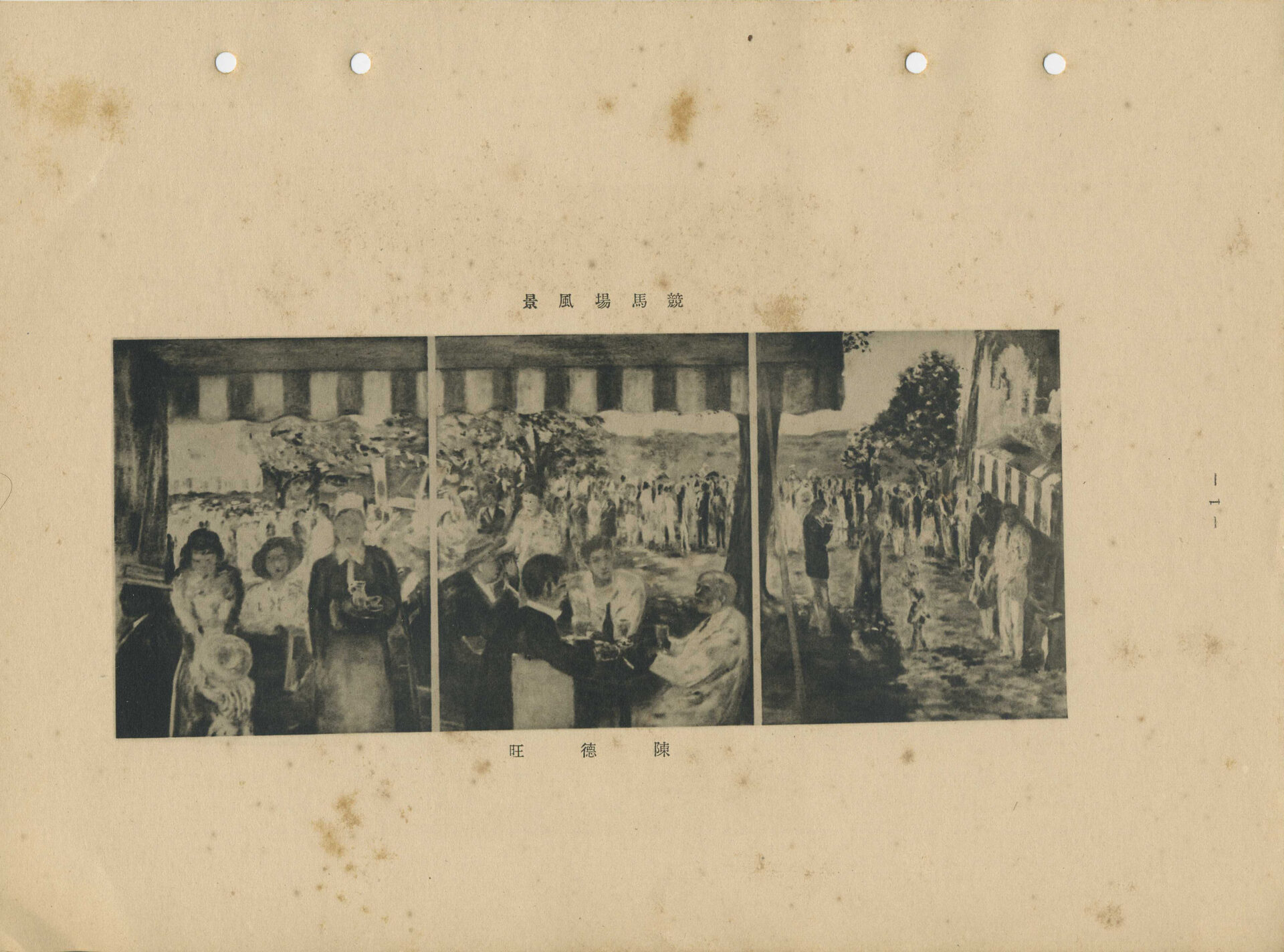 此為1939年(昭和14年)第二回府展西洋畫部陳德旺的入選作。從圖版來看,此幅採三連作,以廣闊的構圖視野描繪「競馬場(賽馬場)」人潮聚集,從事不同活動的景象。左幅前景以女性服務生及遊客為主,服務生手持水杯及玻璃瓶,一旁的婦人穿戴帽子、洋裝與側背包,坐在遮陽棚下休憩,後方可見密集的人影。中幅前景為坐在桌前飲酒聊天的男性遊客,有少有老,後方的民眾似在圍觀遠處的比賽,依稀可見賽馬手的頭部露出。右幅則有孩童的身影,最右側是賽馬場的建築,牆上依稀可見馬匹的彩繪。畫面充斥斑斕的光影處理,類似的主題及明暗、筆觸,讓人聯想到法國印象派畫家雷諾瓦的名作〈煎餅磨坊的舞會〉(Bal du moulin de la Galette,1876,奧賽美術館典藏),同樣著重表現斑斕的光點灑落在景物,以及在戶外聚會從事悠閒活動的市民們。另一方面,此時的陳德旺主要於東京寓居,此作可能是基於畫家對東京賽馬場的印象與寫生所畫。