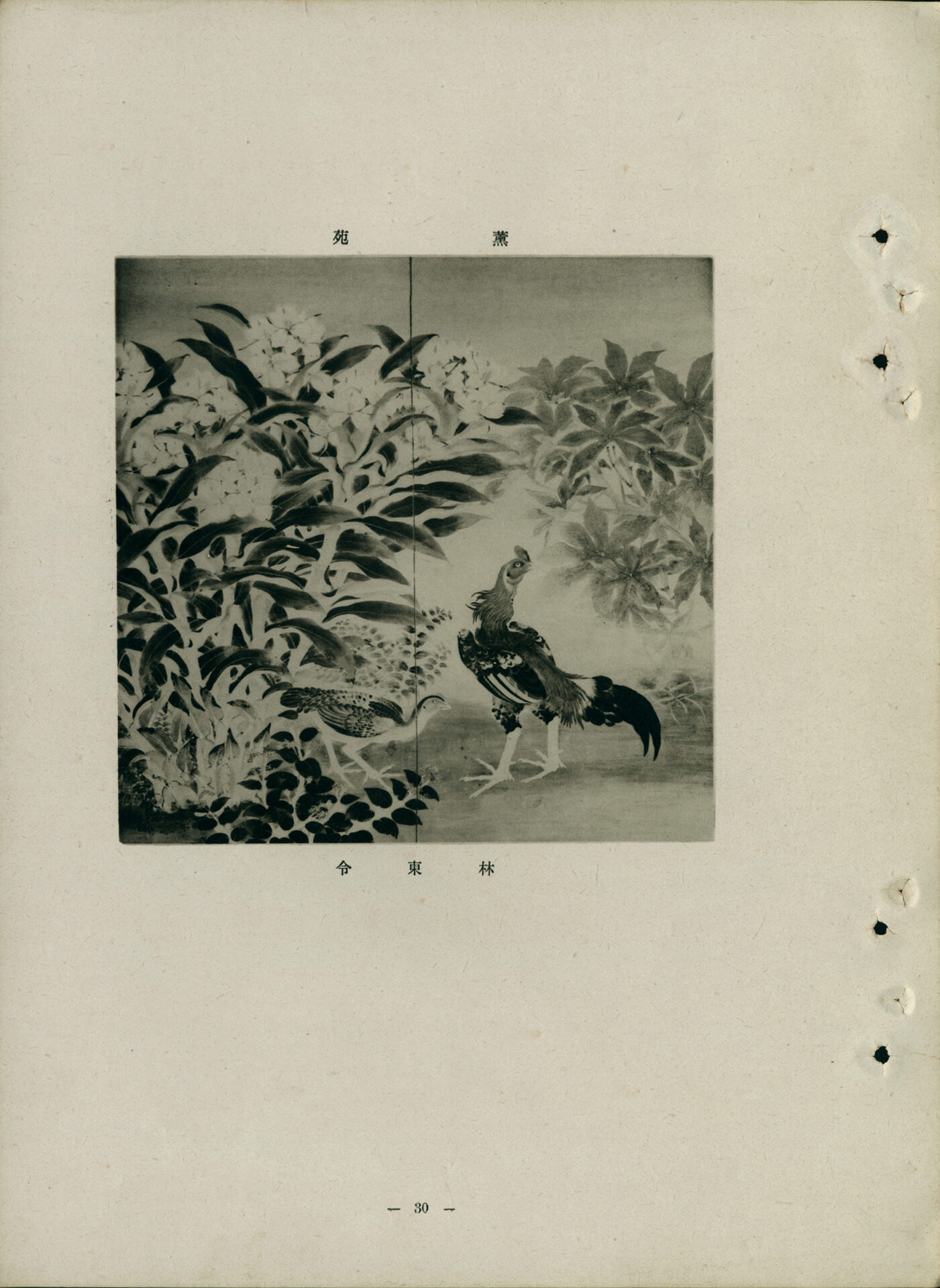此為1941年(昭和16年)林東令入選第四回府展東洋畫部的作品:〈薰苑〉。畫作描繪在庭院散步的雞。畫面中間有一條直線,顯示原作應為二曲屏風。畫面中可以見到一隻身型壯碩的公雞和一隻身型較小的母雞。公雞筆直站立,母雞則壓低身體,兩者的視線皆朝畫面右方望去,顯示應有什麼東西吸引著牠們的注意。花團錦簇的野薑花幾乎佔據畫面左側,長橢圓狀的葉片茂密生長,淺色的野薑花生於莖頂,呈球狀分布。林東令仔細地勾勒雞的羽毛、花紋,以及野薑花的樣態,並利用背景的留白和右方植物刷淡且漸層的色彩,營造出畫面的空間感。野薑花盛開時會散發出香氣,與題名的〈薰苑〉相呼應。