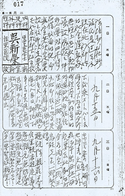 此係吳新榮1933年9月14日日記,共二則。第一則日記寫道大舅子毛昭義來信提及近日為蟋蟀繁殖季節,全家一起捕蟋蟀;學弟陳清鐘在高雄開業,來信表示生意不好。第二則日記記述吳新榮父親吳萱草與友人至頭港子歡迎吳三連夫婦到佳里,陪同接待者有陳柱、陳文玉、陳哮、莊珍等人。當晚,吳新榮與父親商談開設醫院等事項。   日記提及的學甲頭港子,又作「頭港仔」,為吳三連的故鄉,根據日記所載,當時吳三連為《臺灣新民報》總務,不久即將赴東京任支局長,可能是在出發前返回故鄉頭港子探親,順道與吳新榮父親等人見面。文中提及的陳柱、陳文玉、陳培初等人都曾任學校訓導,其中,陳培初曾參與臺灣農民組合、莊珍曾參與台灣自治聯盟。   1933年,吳新榮正著手經營佳里醫院,從吳新榮日記中可見其打造醫院、構思宣傳的文字手稿,擁有「東京醫學士」學歷的吳新榮,能治內科、兒科、外科和性科。大抵而言,從這篇日記可以看見吳新榮父親吳萱草的交友網絡,透過友人身分亦可見當時由台灣創辦的雜誌運作與社會運動等情況,以及吳新榮擬開業前,包含土地租借與廣告宣傳的各項準備。