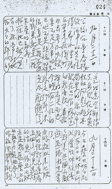 此係吳新榮寫於1933年9月23日日記,今日為祭日,明日為星期日;從昨夜至今已在七股庄往診五次;昨夜頂街向下街舉挑戰旗,是佳里有名的舉暗藝。   日記中使用的「祭日」二字是日文漢字,源自「祝祭日」一詞,即祝日和祭日。祝日是國定休假日,祭日則是指皇室或神社舉行祭儀的日子。日治時期的臺灣與日本本土一樣實施祝祭日,此篇日記寫於9月23日,這一日是「秋季皇靈季」即敬拜歷代天皇的日子,以天皇為中心,透過參拜、紀念的祭祠儀式,加之宣傳、報導等方式,將天皇形象與國家認同植入臺灣人心中。   又,日記中提及的「暗藝」是佳里鎮自每年農曆8月1日起,以金唐殿前的古井分界北南,由以北的頂街和以南的下街為中心,上、下兩街於活動期間,在夜晚各自迎請歌仔戲較勁的傳統活動,此活動通常為期30天左右,至一方無法再持續為止。因在夜間舉行而名之,由於活動時間長,且花費金錢、人力,日治時期被禁止,戰後有再興起的情況。
