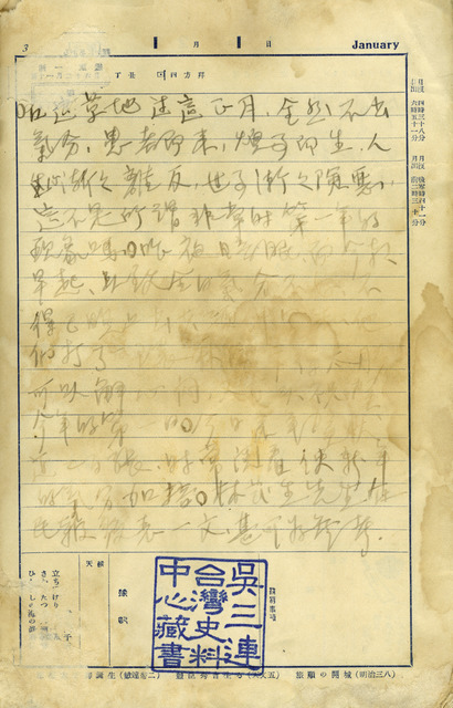 此係吳新榮寫於1935年1月1日日記,今日為新年正月,吳新榮對人心和世事有所感嘆;收到賀年卡近二百張;晚上至酒仲賣打麻將;閱讀林茂生《民報》上的文章。   今天是新曆年1月1日,不過,從日記中卻感受到吳新榮沒有過新年的心情,文字中感嘆「人心漸漸離反,世事漸漸險惡」,這或許與前一年底,吳新榮與友人們成立的青風會在衝突中無奈解散有關。又,日記中提到的酒仲賣是日治時期的菸酒配銷所,昔日台灣實施菸酒專賣制度,而專賣局兼有行政與產銷的權利。從吳新榮日記不僅可見其日常生活,亦可認識當時台灣的社會文化面向。   值得再提的是,日記中的林茂生是台灣第一位留學美國哥倫比亞大學的哲學博士,戰後創立《民報》。1947年二二八事件發生後,擔任二二八事件處理委員會主席,3月11日,警備司令部派來至林家將林茂生帶走後,便再無音訊。