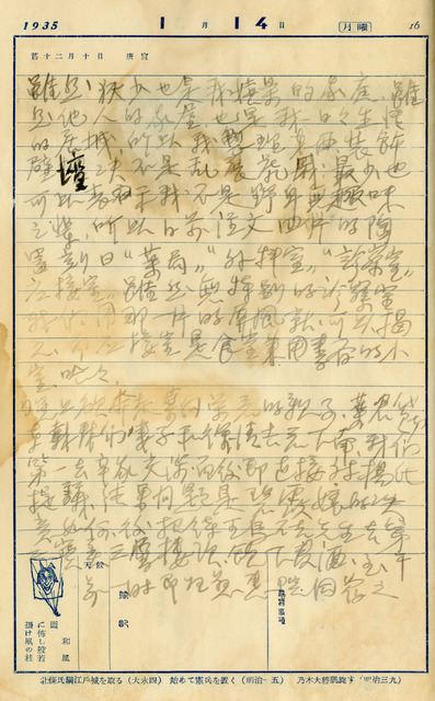 此係吳新榮寫於1935年1月14日日記,記述整理,訂了四片刻字的陶片為醫院隔間之用;晚上,與妻子毛雪、葉向榮、徐清吉等人向楊碧霞提親一事,一行人後與王烏硈赴第二寶美樓。   日記中提到的藥局、外科室、診療室等,是吳新榮經營的佳里醫院內部設計,在1933年9月30日的日記中繪有佳里醫院病房的設計圖。吳新榮於1932年11月繼承叔父吳丙丁的佳里醫院,為拓展醫院設備和病房數,在租地、添購器材、廣告宣傳等事項,投入不少心力,由於醫院和病房建置後需經官廳檢查始可營運,在這過程中,幾度遭警部人員刁難,終於在1933年12月1日正式取得醫院經營執照。又,日記中提到友人們一起幫忙葉向榮的親事,是指為撮合好友葉向榮與楊碧霞的婚事,為此,吳新榮夫婦成為大「冰人」(媒人),終在1935年5月15日結為連理。